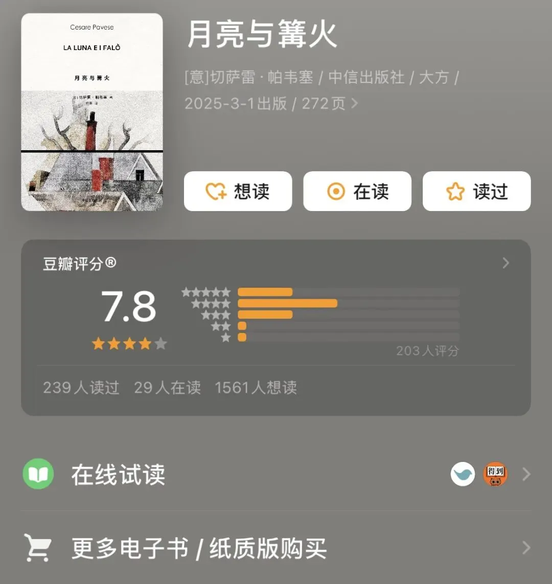 帕韦塞,这位战后意大利文学的引路人、卡尔维诺的精神导师,将他毕生对身份、流亡与归属的思考凝聚于此。小说中弥漫的诗意哀愁与存在叩问,与其在出版次年选择离世的生命轨迹相互映照,使文本超越个人叙事,成为一代人精神困境的永恒寓言。