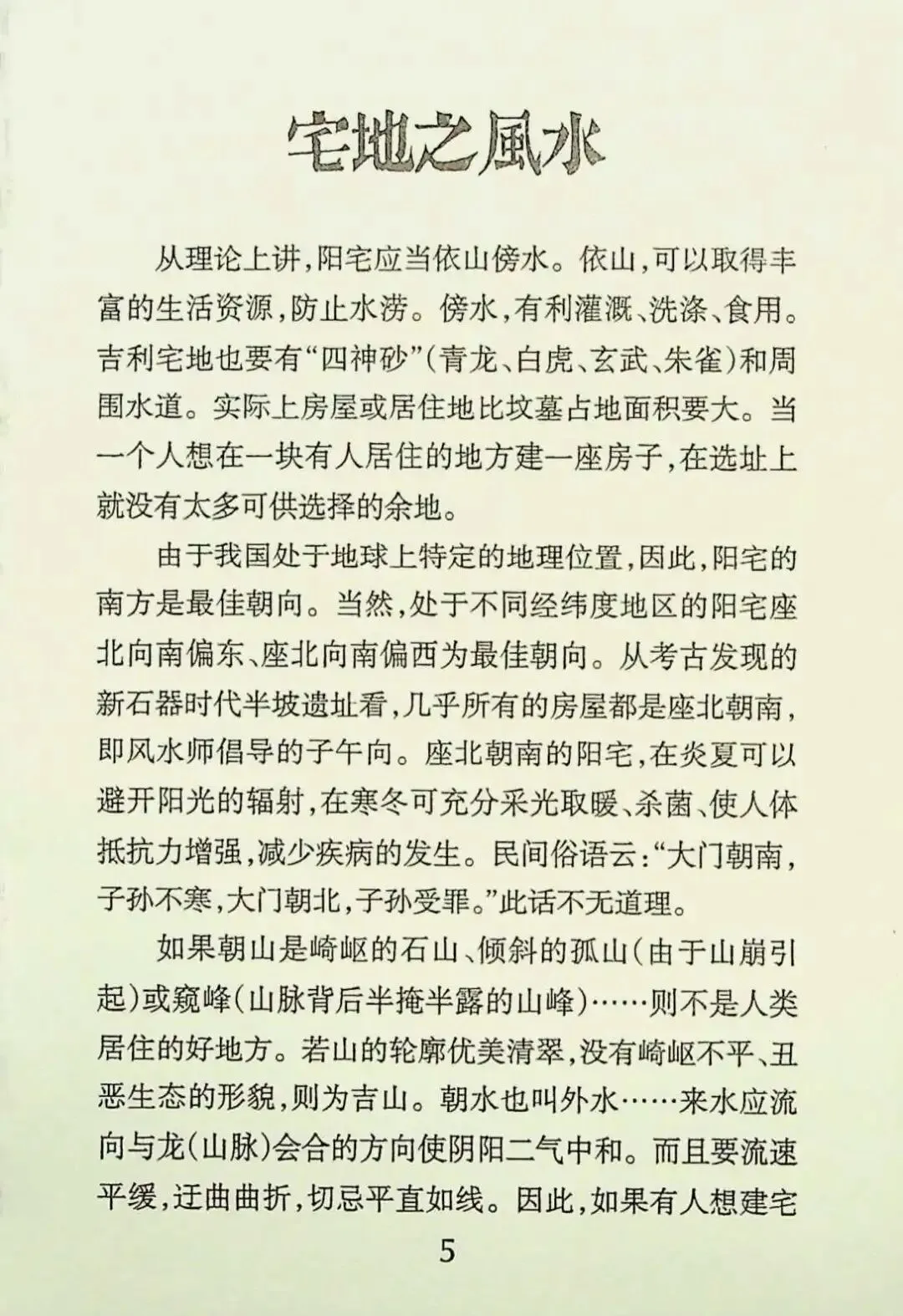 阳宅风水,风水学术语。风水宝地标准:后有靠山、左有青龙、右有白虎、前有案山、中有明堂、水流曲折。