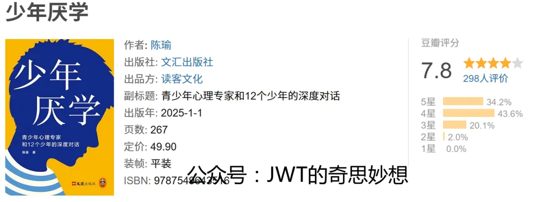 《少年厌学》是青少年心理专家陈瑜的著作,副标题“青少年心理专家和12个少年的深度对话”点明其核心内容。本书基于作者与12名厌学少年的真实访谈,深入探讨他们行为背后的心理动机、家庭环境与社会期待之间的复杂冲突。