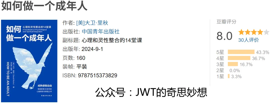 《如何做一个成年人》是美国心理学家大卫·里秋的经典著作,副标题“心理和灵性整合的14堂课”点明全书主旨。本书旨在通过心理与灵性相结合的实践路径,帮助读者在纷繁复杂的现代社会中,培养内在成熟、情感独立与精神完整的“成年人”状态。