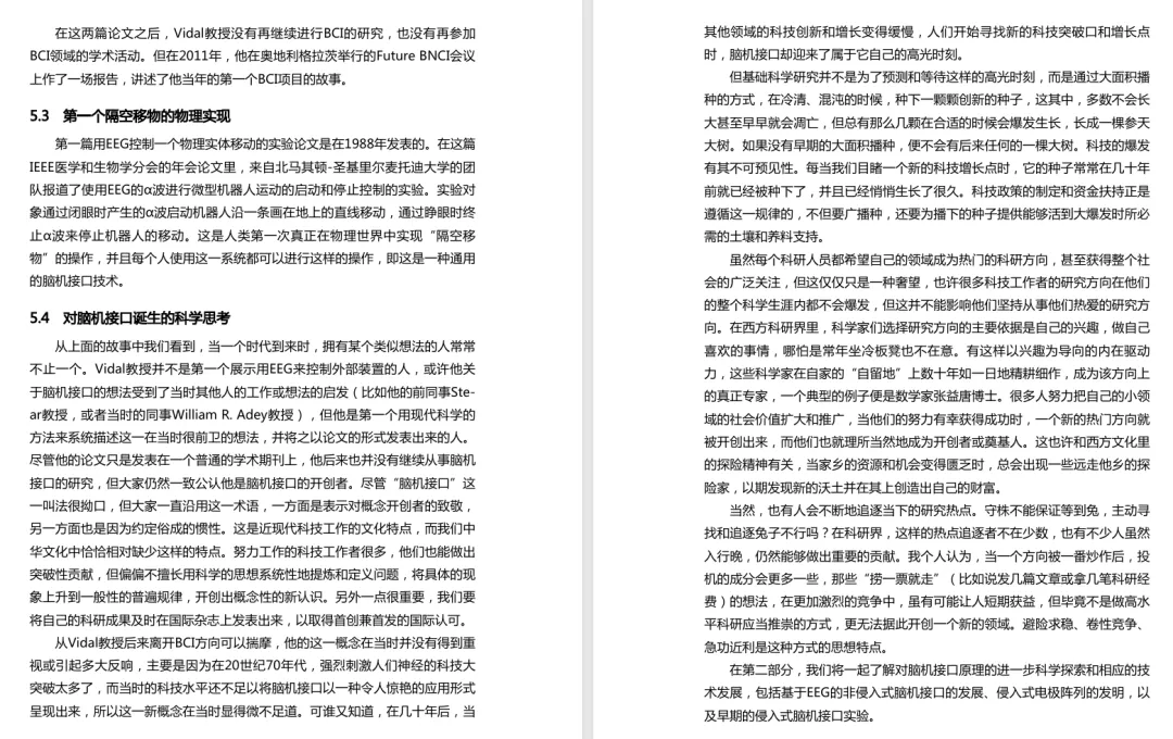 1924年德国学者汉斯·贝格尔发现了脑电波;1938年美国神经学家赫伯特·贾斯珀在寄给汉斯·贝格尔的圣诞贺卡中,畅想了从脑电波中解码出语言的可能性,这被认为是对脑机接口的早期科幻描绘。控制论之父维纳也在20世纪40年代思考了包括脑机接口在内的一些生物控制论问题。中国著名科幻作家王晋康在其科幻处女作《亚当回归》中描写了被植入人脑的芯片成为第二智能,最终第二智能导致人类实际被AI所寄生的情节。可以说,王晋康先生是中国最早提出脑机接口科幻思想的人。