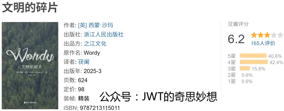 《文明的碎片》是英国历史学者西蒙·沙玛的文集,原名 Wordy,中文版由茯阑翻译,浙江人民出版社出版,之江文化出品。本书收录了作者跨越数十年的历史评论、随笔与演说,以“碎片”为隐喻,呈现其对文明进程中偶然、断裂与被忽视细节的持久凝视。