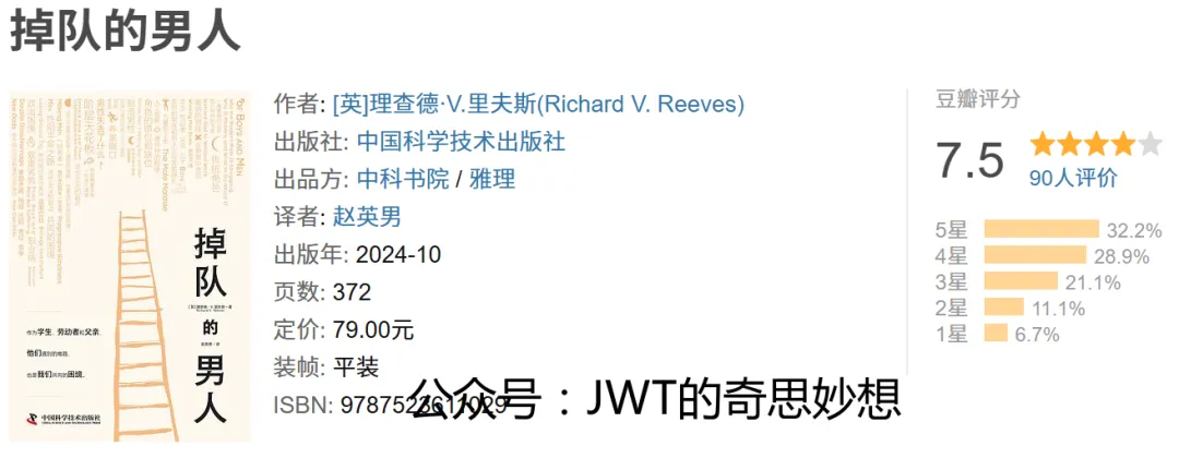 《掉队的男人》是英国学者理查德·V.里夫斯的著作,聚焦当代社会中男性在教育、职场、家庭等领域面临的系统性困境。书中提出,传统性别角色的固化与社会经济结构的变迁,使部分男性在学业成就、职业适应与父亲角色中逐渐“掉队”,这一现象不仅是男性个体的危机,更是家庭稳定与社会发展的共同挑战。