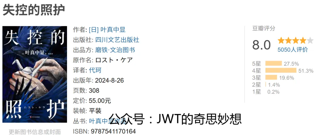 《失控的照护》是日本作家叶真中显的社会派推理小说,由代珂翻译、四川文艺出版社出版。本书以“照护”为切口,深入剖析日本社会老龄化背景下的家庭困境、制度缺失与人性的幽微。