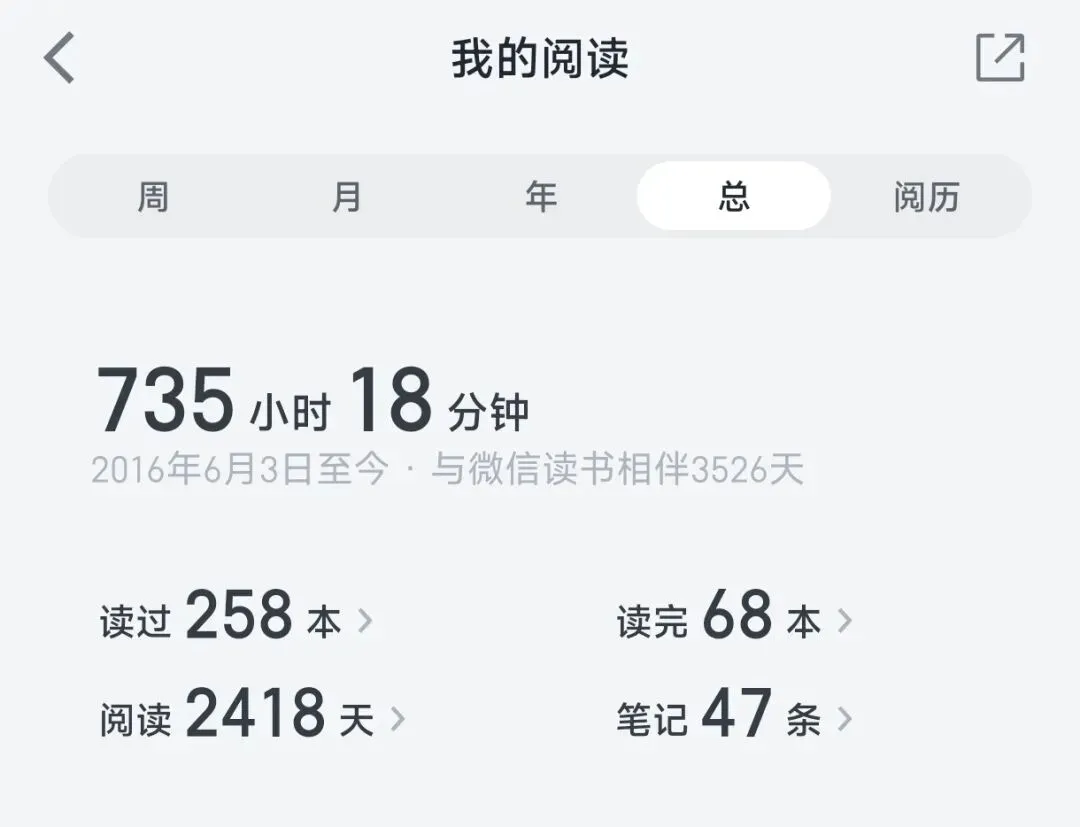 后来,无意中下载了微信读书,开始在上面打卡,慢慢的养成了常常阅读的习惯,慢慢的已经阅读了735个小时,读完了68本书,虽然大多数时候我只钟情于文学小说。