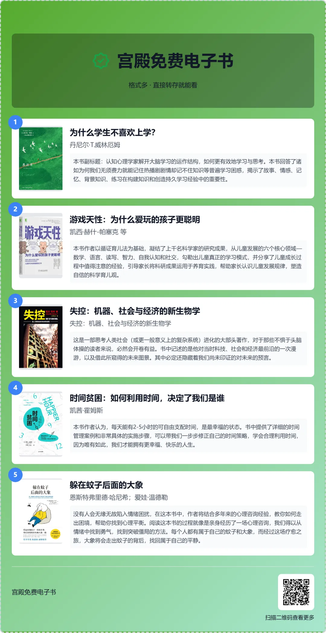 【免费电子书】为什么学生不喜欢上学,游戏天性:为什么爱玩的孩子更聪明,失控:机器、社会与经济的新生物学,时间贫困,躲在蚊子后面的
