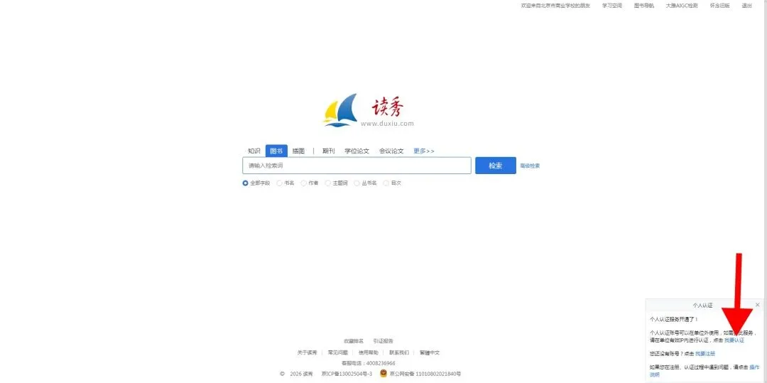 注:如您想在校外网域使用【读秀】,请务必提前在校内网域内进行认证操作(操作一次即可)。