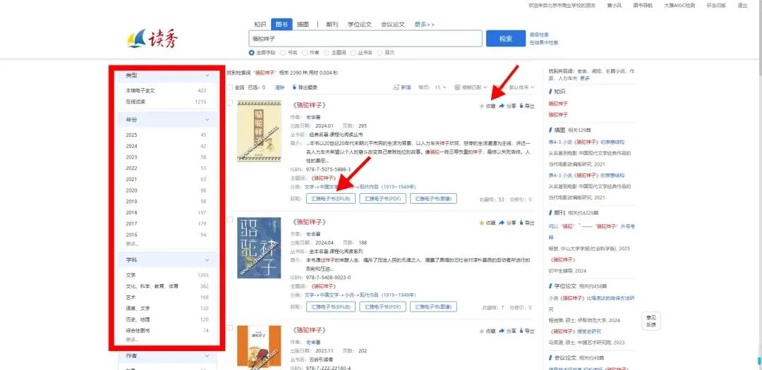 左边选项框可针对类型、出版年份等进行再次筛选。点击<汇雅电子书EPUB>对目标文献进行阅读;点击<收藏>,目标文献信息将储存在学习通云盘中。