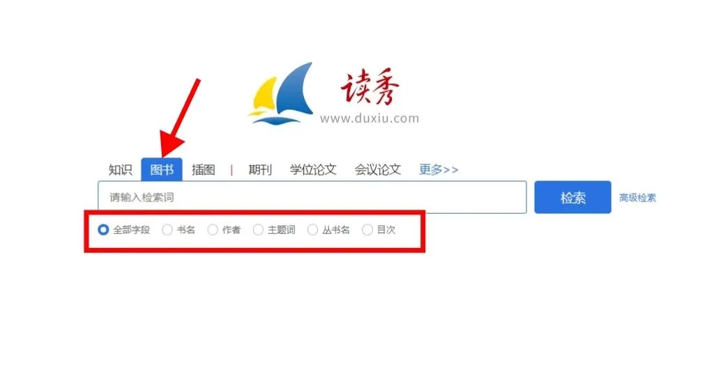 点击<图书>选项,选择搜索范围,输入检索词,点击<检索>。