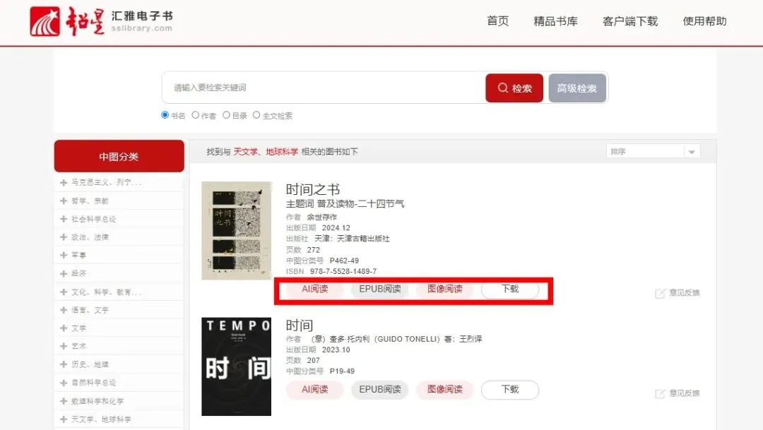 左边选项框可针对类型、出版年份等进行再次筛选。点击<汇雅电子书EPUB>对目标文献进行阅读;点击<收藏>,目标文献信息将储存在学习通云盘中。