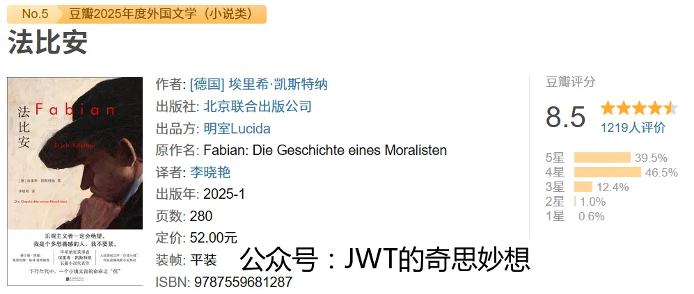 《法比安》是德国作家埃里希·凯斯特纳的长篇小说,以其冷峻讽刺的笔触著称。故事背景设定在二十世纪三十年代初的柏林,通过主人公法比安的命运,描绘了魏玛共和国末期社会的动荡与道德危机。