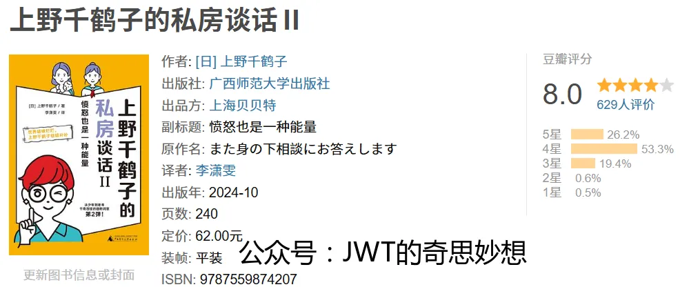 《上野千鹤子的私房谈话II》是日本女性主义学者上野千鹤子的一本问答集,主题聚焦于日常生活中的情绪与关系困境。本书副标题“愤怒也是一种能量”揭示了其核心主张:鼓励读者,尤其是女性,正视并转化愤怒等负面情绪,将其视为推动自我觉醒与社会改变的动力。