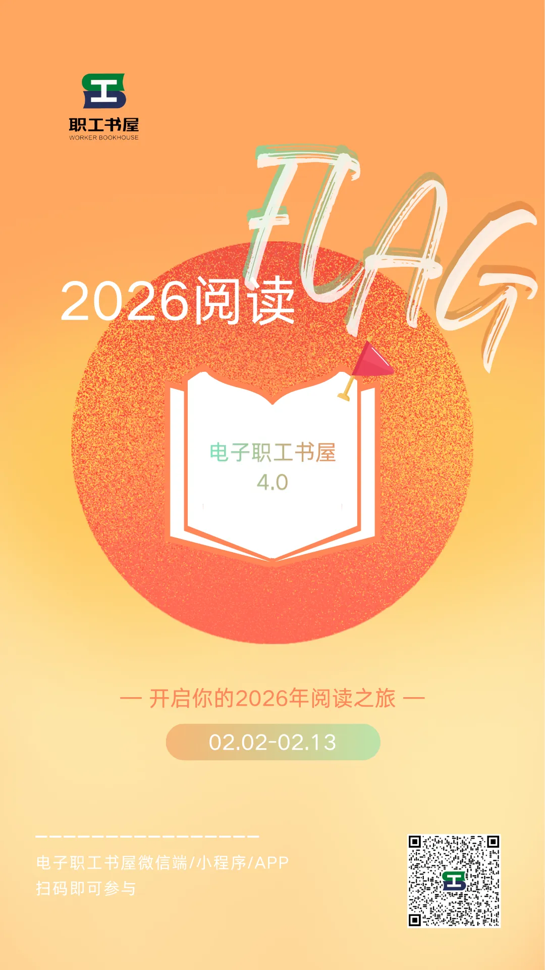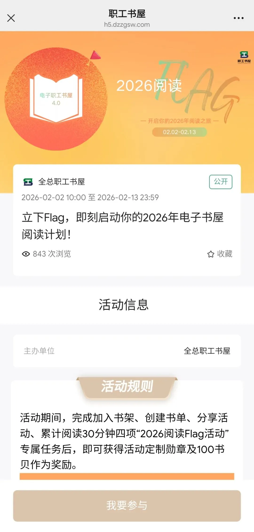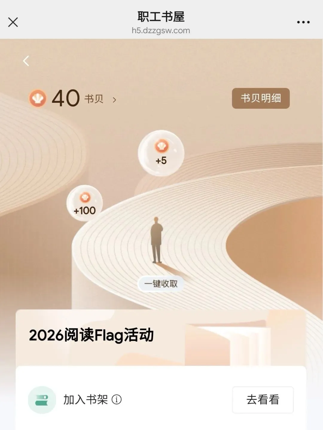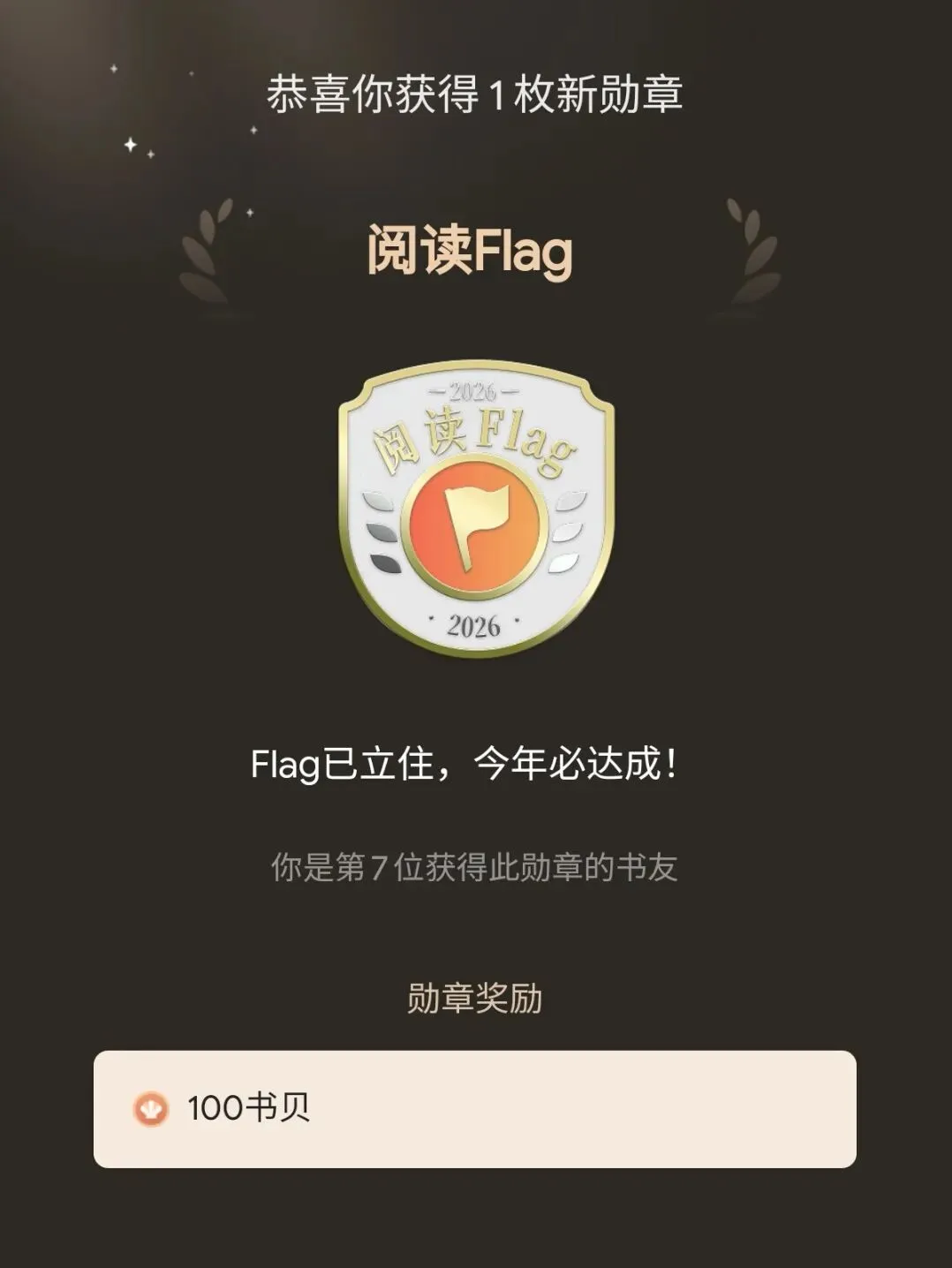 活动期间,完成加入书架、创建书单、分享活动、累计阅读30分钟四项“2026阅读Flag活动”专属任务后,即可获得活动定制勋章及100书贝作为奖励。