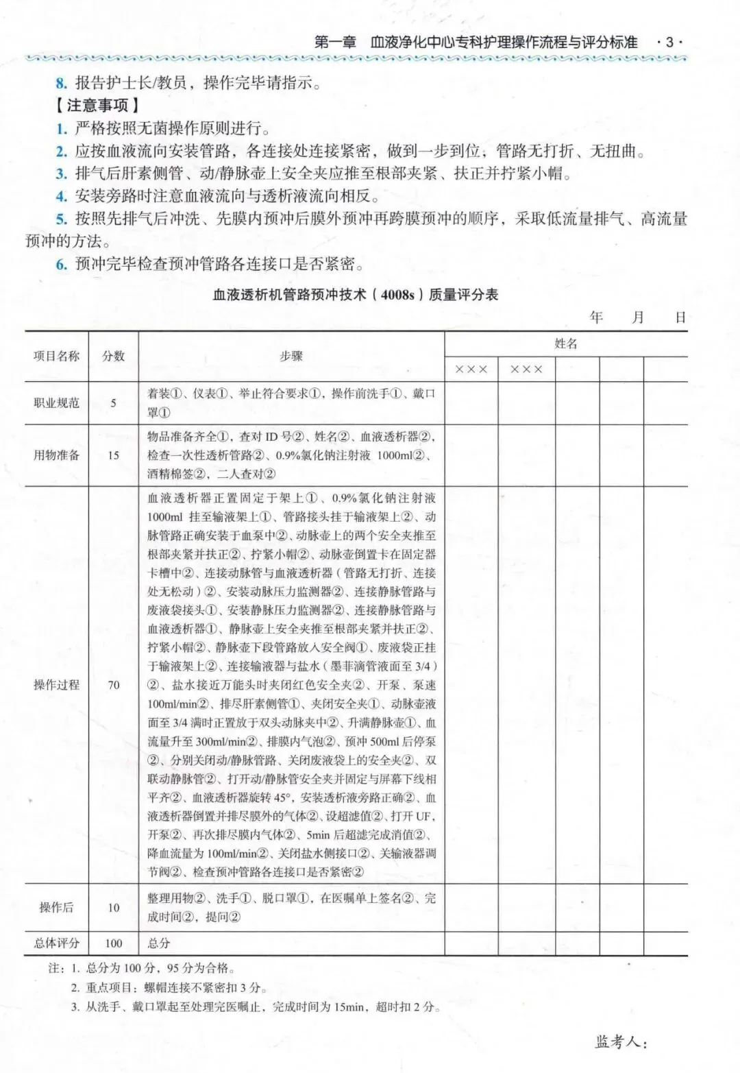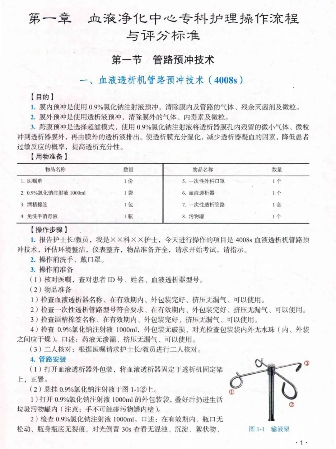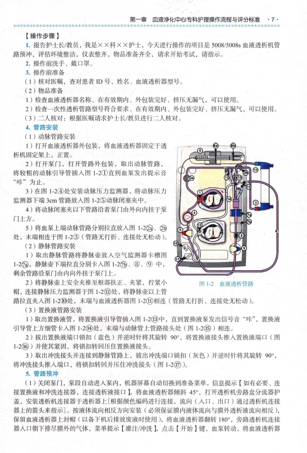 第一章 血液净化中心专科护理操作流程与评分标准第一节 管路预冲技术一、血液透析机管路预冲技术(4008s)二、血液透析滤过机管路预冲技术(4008s)三、血液透析滤过机管路预冲技术(5008/5008s)四、血液透析联合血液灌流预冲技术第二节 上机操作技术一、血液透析动静脉内瘘穿刺上机技术(4008)二、人工血管移植内瘘穿刺技术三、血液透析滤过动静脉内瘘穿刺上机技术(4008)四、血液透析滤过动静脉内瘘穿刺上机技术(5008/5008s)五、多普勒超声引导下内瘘穿刺上机技术六、中心静脉导管上机技术七、血液透析联合血液灌流技术第三节 下机操作技术一、血液透析动静脉内瘘穿刺下机技术(4008)二、血液透析滤过动静脉内瘘穿刺下机技术(4008s)三、血液透析滤过动静脉内瘘穿刺下机技术(5008/5008s)四、中心静脉导管下机技术第四节 废液排放一、费森尤斯血液透析机废液排放(4008/4008s)二、费森尤斯血液透析机废液排放(5008/5008s)三、百特血液透析机废液排放四、金宝血液透析机废液排放五、旭化成血液透析机废液排放六、山外山SWS-6000血液透析机废液排放第五节 中心静脉导管维护一、中心静脉导管换药技术二、中心静脉导管封管技术三、中心静脉导管溶栓技术四、分隔膜无针密闭式输液BD接头的使用技术第二章 血液净化中心CRRT操作流程与评分标准一、单重血浆置换技术二、胆红素吸附技术三、缓慢连续性超滤技术四、双重血浆分子吸附技术五、双重血浆置换技术六、血液灌流技术第三章 血液净化中心医院感染防控监测操作流程与评分标准一、血液透析机内部消毒流程二、血液透析机外部消毒流程三、手卫生(六部洗手法)四、手卫生(快速手消毒)五、pH监测六、软硬度监测七、透析液内毒素(离子)监测八、透析液及透析用水感染监测九、透析用水化学污染物监测十、透析用水内毒素(离子)监测十一、透析用水细菌监测十二、余氯监测十三、置换液内毒素(离子)监测十四、置换液细菌监测十五、空气细菌监测十六、物表细菌监测十七、医院感染暴发报告及处置流程十八、职业暴露的标准防控流程十九、“危急值”报告制度及处置流程第四章 血液净化中心常用设备操作流程及评分标准一、体外红光照射治疗仪二、非热康谱治疗仪三、透析机日常维护四、4008s血液透析机更换细菌过滤器五、5008血液透析机更换细菌过滤器六、CRRT床旁急诊机维