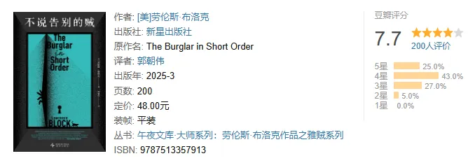 3 DeepSeek:打开财富密码[日] 麻耶雄嵩2025年春节,中国AI黑马DeepSeek汇聚全球目光。本书全面解析了DeepSeek的崛起历程、技术突破及其对AI行业的深远影响;介绍了DeepSeek相关应用方法,包括优化交互方式、调用API服务、本地部署模型等;分析了DeepSeek即将引发的行业变革,以及其AI能力在垂直行业领域的应用。四十年前,美国侦探小说大师劳伦斯·布洛克创造了一个享誉世界的角色:伯尼·罗登巴尔,一位聪明、灵巧的窃贼。他不仅偷走了古董、邮票收藏和无价的艺术品,还偷走了数百万读者的心。