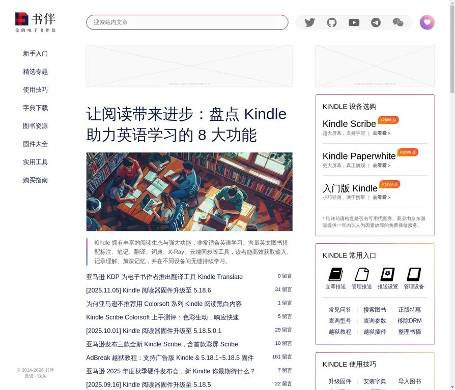 书伴主要服务 Kindle 用户,专注阅读体验优化。特点包括:(1)设备使用教程丰富;(2)电子书资源推荐实用;(3)工具支持齐全。用阅读器的老师可以重点收藏。