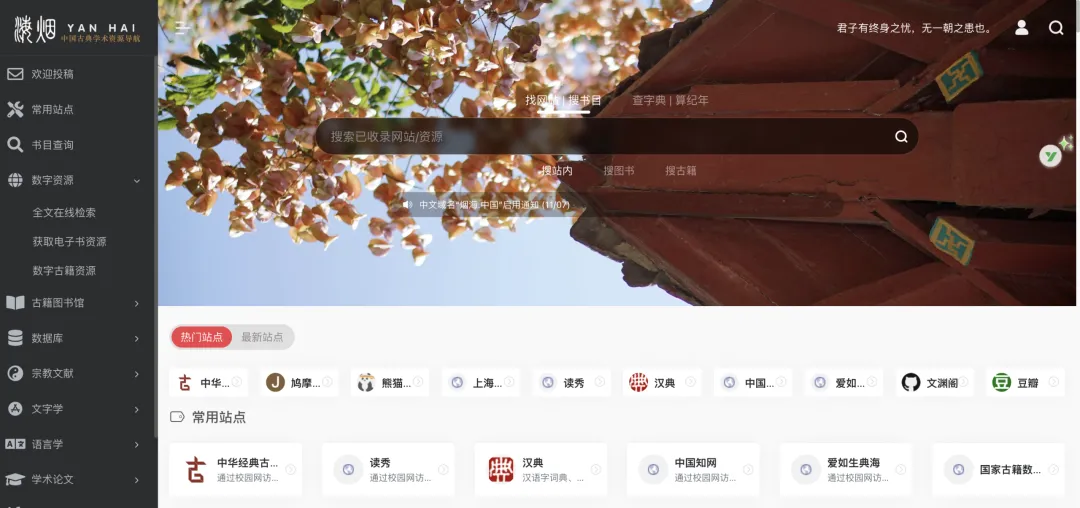 烟海属于专业学术导航类网站,偏向文史哲方向。特点包括:(1)资源聚合能力强;(2)学术导向明确;(3)分类系统清晰。做传统文化研究很实用。