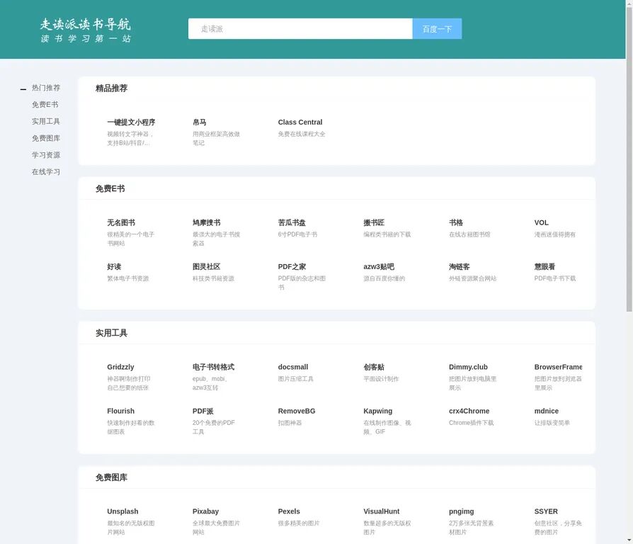 走读派属于综合学习导航平台,功能覆盖面很广。主要特点是:(1)资源整合能力强;(2)工具与学习资源并存;(3)适合做长期学习入口。
