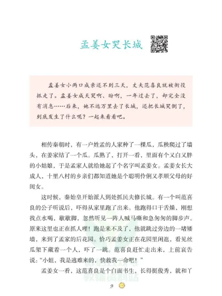 8.孟姜女的丈夫名叫范喜良,死后被埋在长城根下,孟姜女哭倒长城八百里的故事,反映了劳动人民对自由幸福生活的渴望与追求。