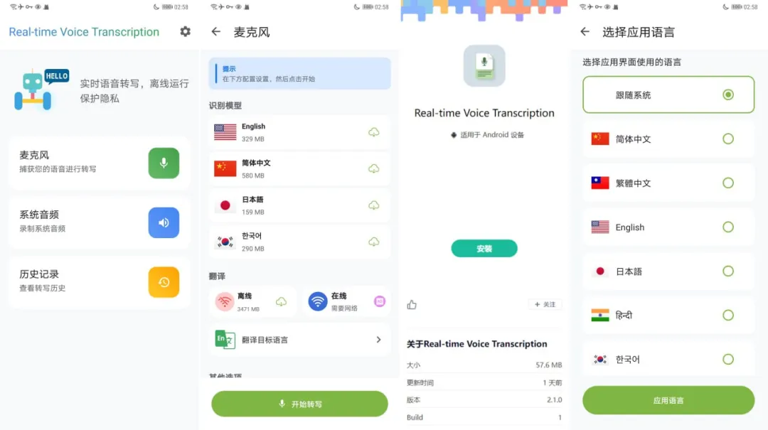 这是一个安卓系统的语音转文字工具,可实时将语音转录为文字,支持麦克风录音和识别系统音频,支持多种语言模型,支持在悬浮窗中显示转写结果,支持转写历史记录,本地离线运行,界面有少量广告,但不影响使用,完全免费,无需注册 #语音转文字