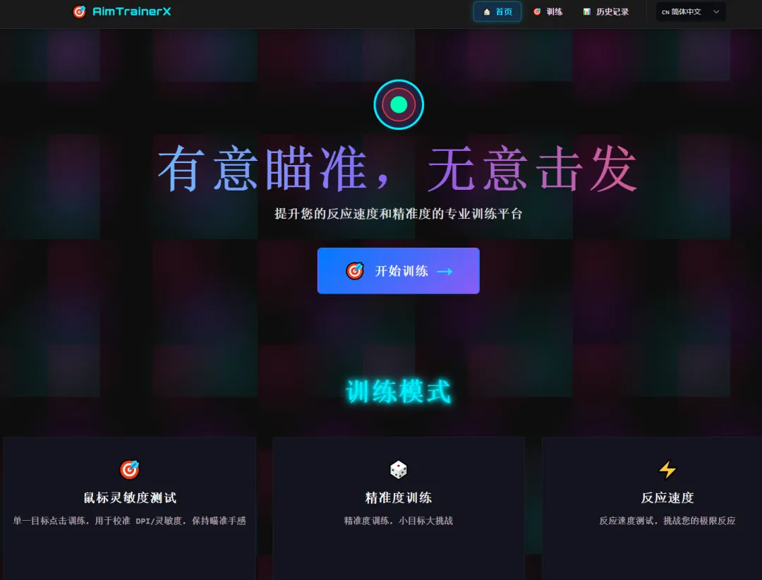 这是一个专注FPS枪法训练的在线平台,提供反应速度、跟枪、甩枪、定位等10余种科学训练模式,实时记录KPM、准确率与反应时间。支持灵敏度测试、精准度训练、反应速度训练、移动目标训练、追踪训练、自定义挑战等模式,并可自定义目标样式、目标大小、目标个数、训练时长等,还提供了数据分析和训练历史记录,、准星样式与目标大小,数据云端同步,可对比全球玩家排名。无需下载,浏览器即开即练,中文界面无广告,是《CS2》《Valorant》《Apex》玩家提升枪法的免费健身房 #FPS