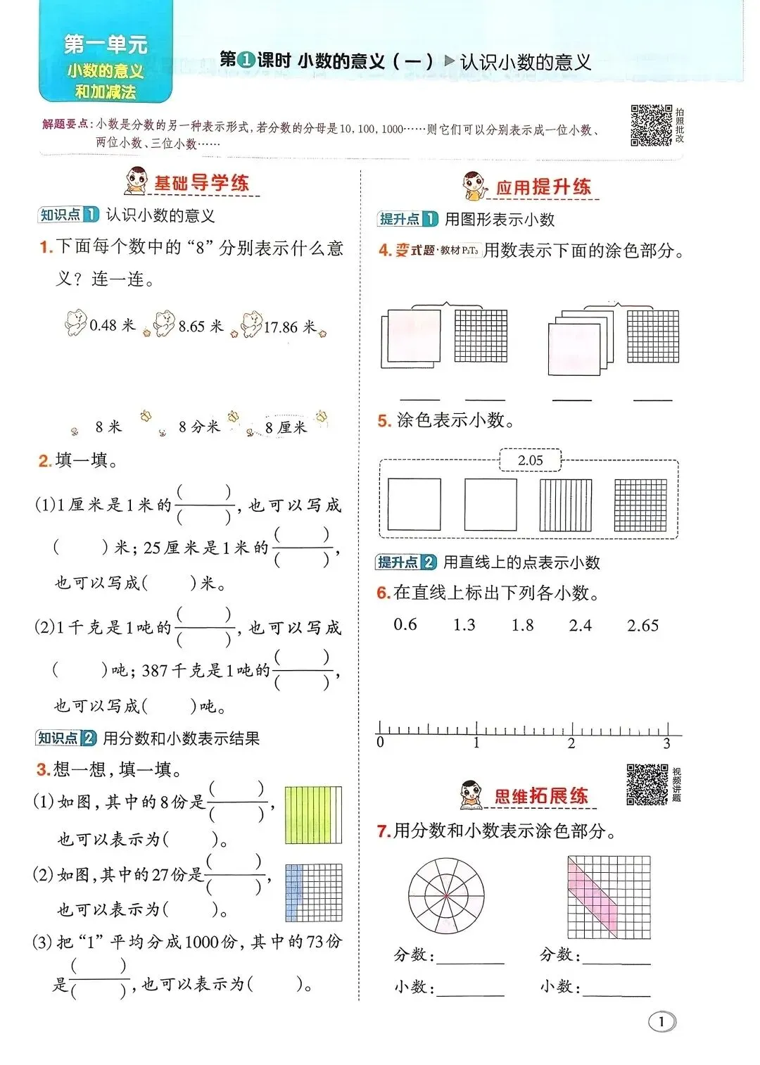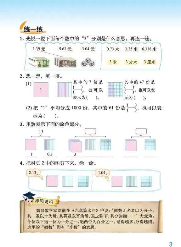 本系列是针对四年级下册每一课时的内容,跟大家共享电子书和每节课的微课,以及自己的一些初浅想法,并附上配套的练习,如果有孩子刚好需要预习或者回顾复习可以自取。今天是这篇是第一单元第一课时,小数的意义(一)。
