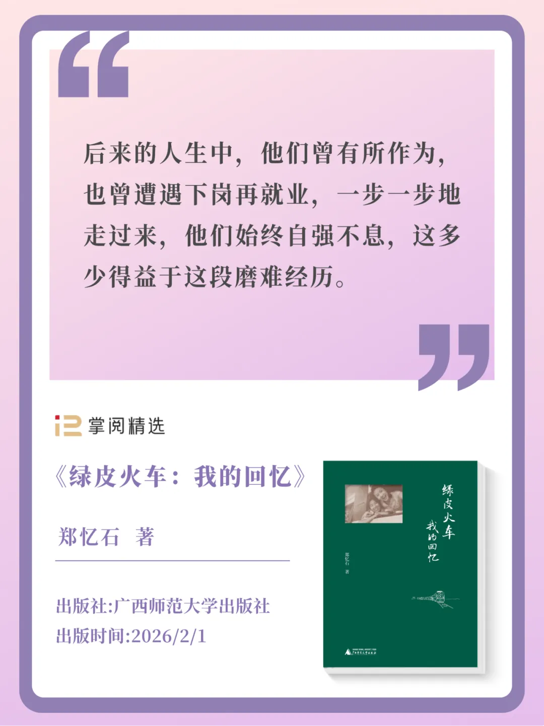 这是一部以“绿皮火车”为意象的个人回忆录,通过家庭相册与个人叙述,真切呈现了百年变迁中普通人的跋涉、温情与尊严,既是个人史、家庭史,也是社会史。