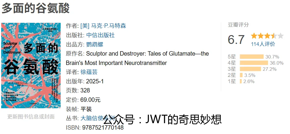 《多面的谷氨酸》是美国神经科学家马克·P. 马特森撰写的一部科普著作。本书聚焦于大脑中最重要且最普遍的神经递质——谷氨酸,深入探讨了它在神经系统中的双重角色:既是塑造学习、记忆与认知功能的“雕刻家”,也是参与中风、癫痫、神经退行性疾病等病理过程的“毁灭者”。