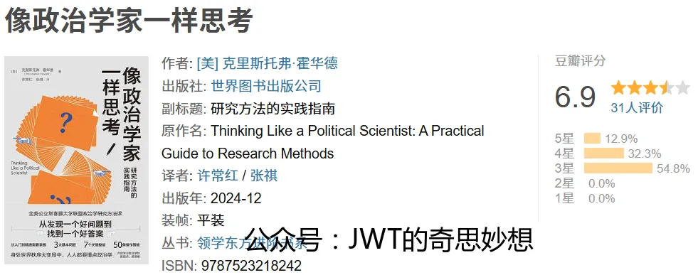 《像政治学家一样思考》是美国政治学者克里斯托弗·霍华德撰写的一部研究方**实践指南,旨在向读者系统传授政治科学研究的核心思维与操作方法。本书以“从发现一个好问题到找到一个好答案”为脉络,围绕政治学研究的基本问题、关键框架与操作步骤展开,帮助读者建立严谨的社会科学分析能力。