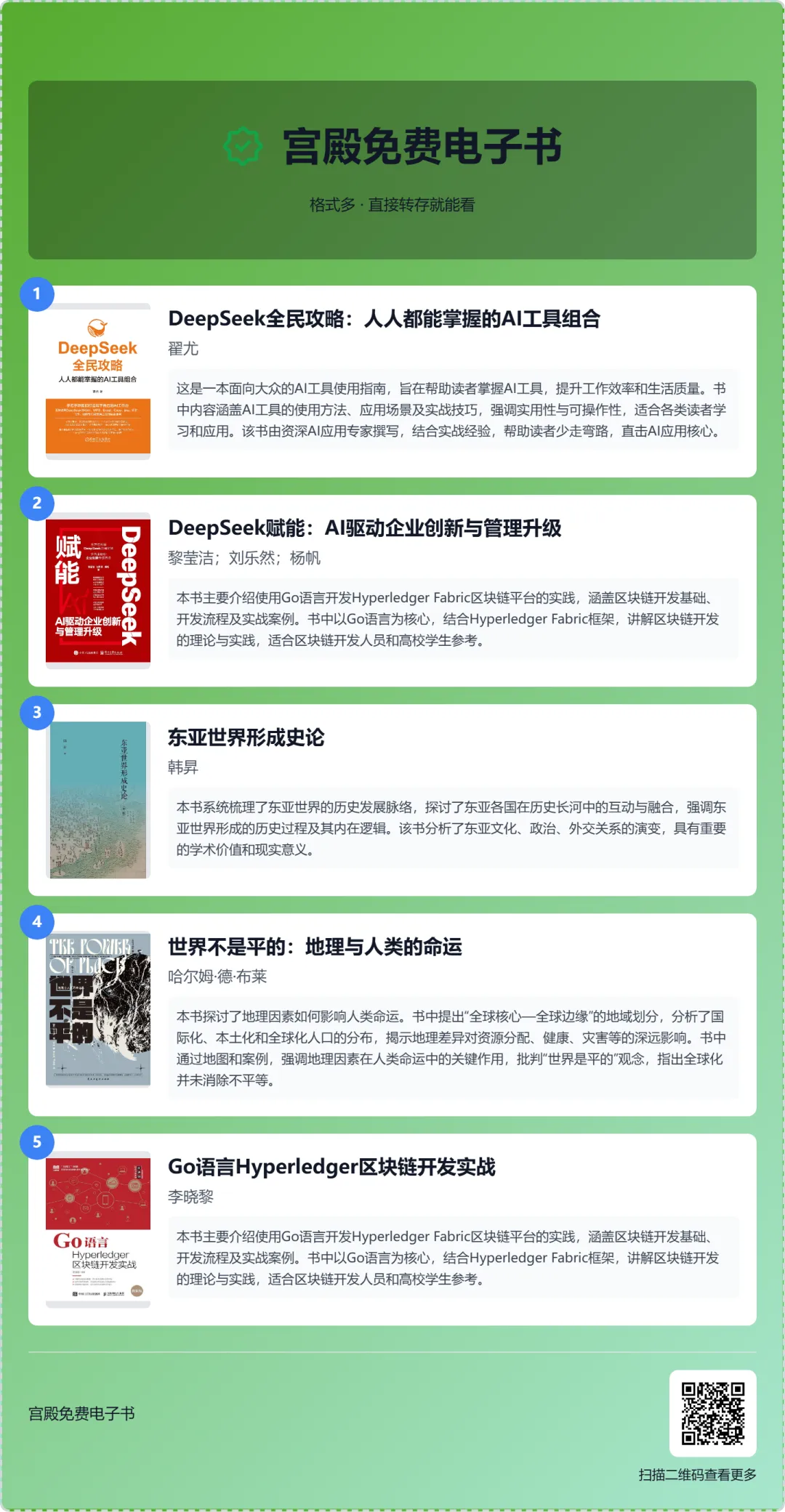 【免费电子书】DeepSeek全民攻略,DeepSeek赋能,东亚世界形成史论,世界不是平的:地理与人类的命运,Go语言Hyperledger区块链开发实战