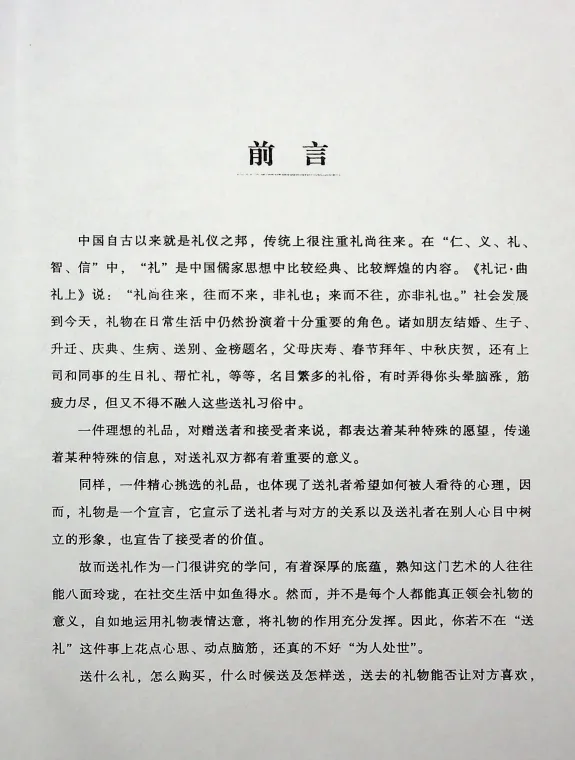 中国自古就是礼仪之邦,传统上很注重礼尚往来。“仁、义、礼、智、信”,其中,“礼”是中国儒家思想比较经典、比较辉煌的一页。发展到今天,送礼也成为人们日常生活中不可或缺的一个重要组成部分。