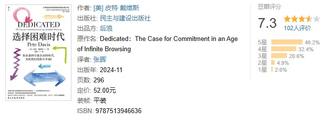 戴维斯深刻剖析了我们害怕或无法做出选择的底层逻辑,以及选择困难的无限循环可能导致我们真正错过什么。只有全情投入,才能把心中愿景化为实际的计划和收获,才能明白我们要如何在充满选择的时代安定心中焦虑的锚。