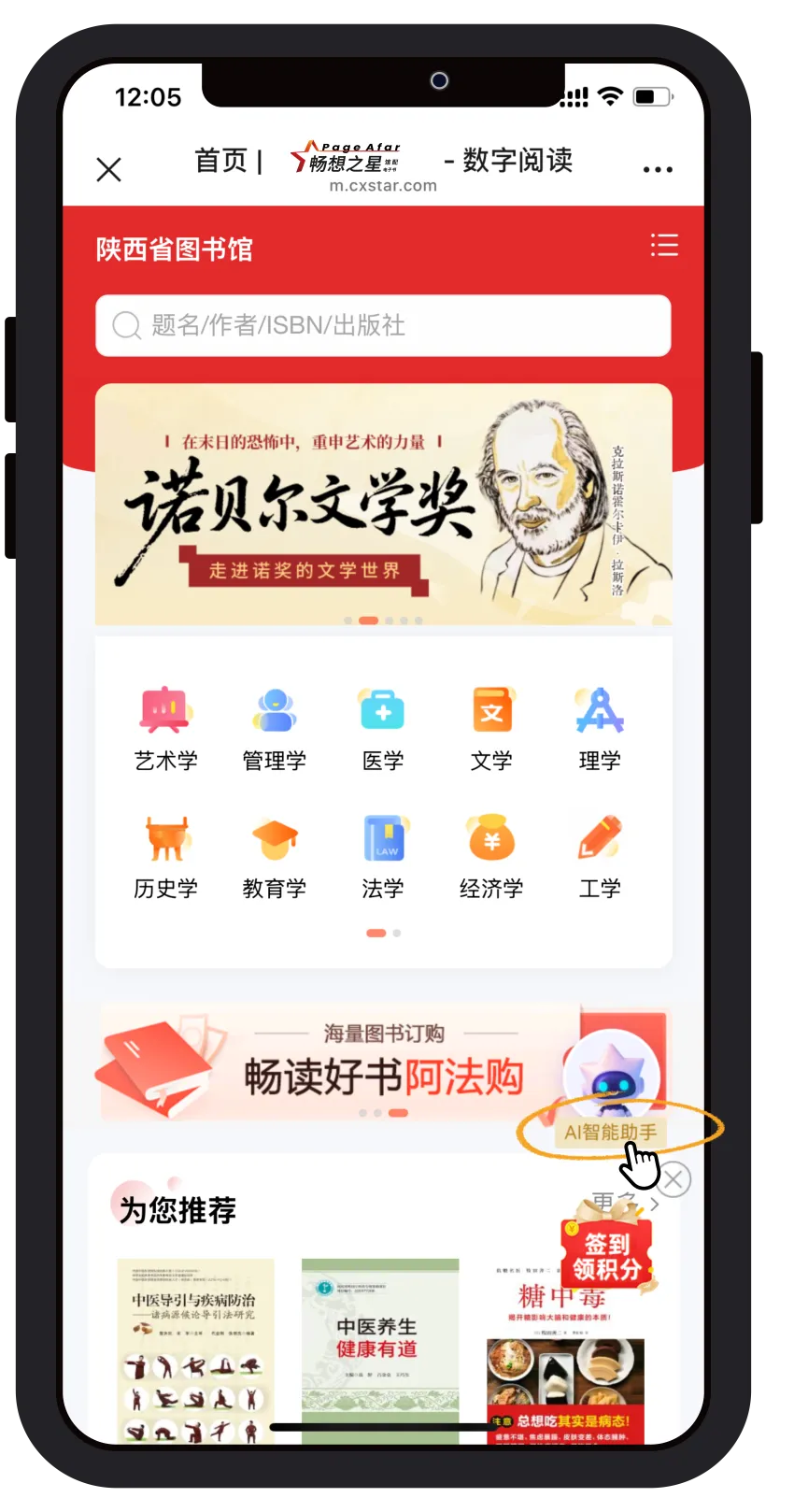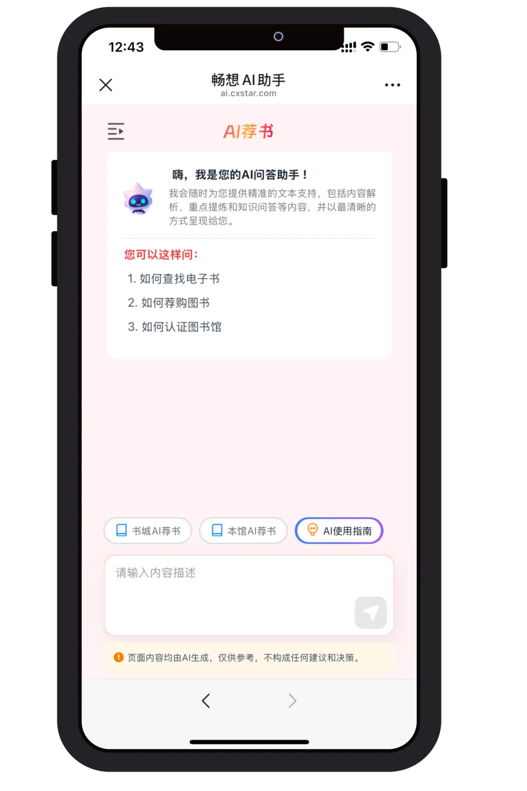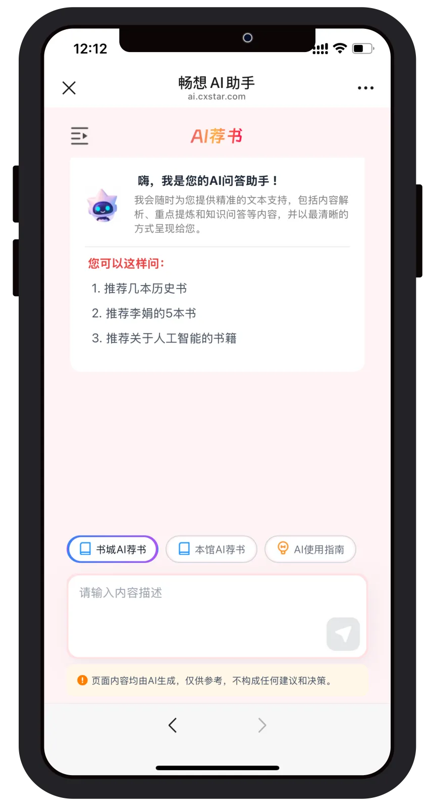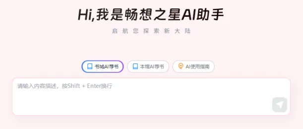 登录后,在图书馆首页右下角找到 AI智能助手小图标,点击进入畅想之星AI助手页面,选择书城AI荐书或本馆AI荐书。