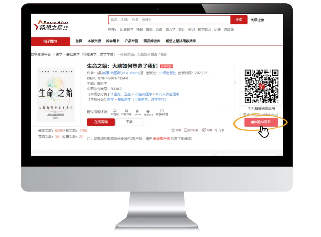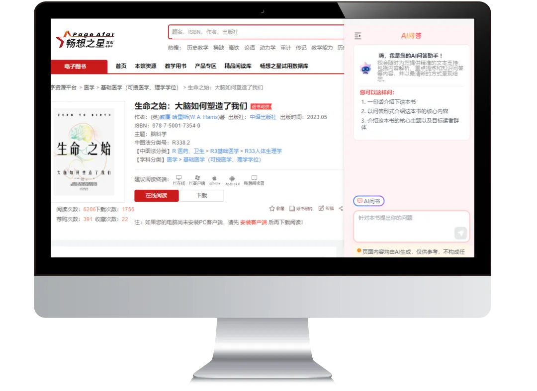 在医药卫生R大类部分电子图书详情增加AI问答入口,支持问答的电子书页面显示“体验AI问书”按钮。其他学科电子书将陆续开通此功能。