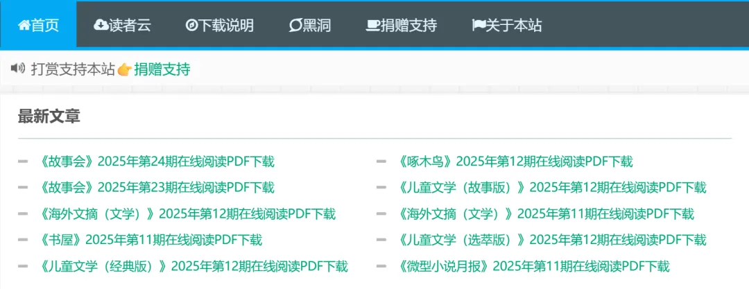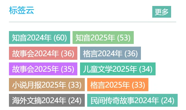 要是不想看首页推荐,那么就来看看标签云,这里清晰记载了每个栏目的资源数量。如小编喜欢的小说月报,光2025年就有33,民间传奇故事去年有24。都是精挑细选过的资源,且全部免费。