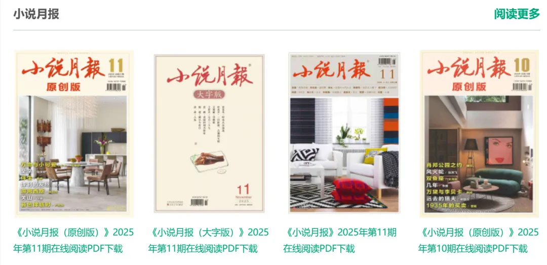 除了小说月报以外,这里还有多个章节。如北京文学、知音、十月、书屋、海外文摘、花城、杂志等等。如果有其他喜欢的栏目,不妨在这里搜索试试。说不定会有惊喜等着你。
