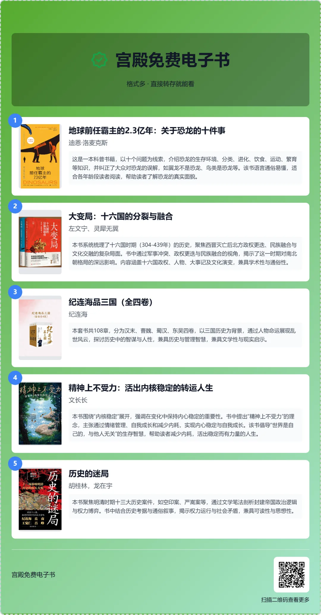 【免费电子书】地球前任霸主的2.3亿年:关于恐龙的十件事,大变局:十六国的分裂与融合,纪连海品三国,精神上不受力,历史的迷局