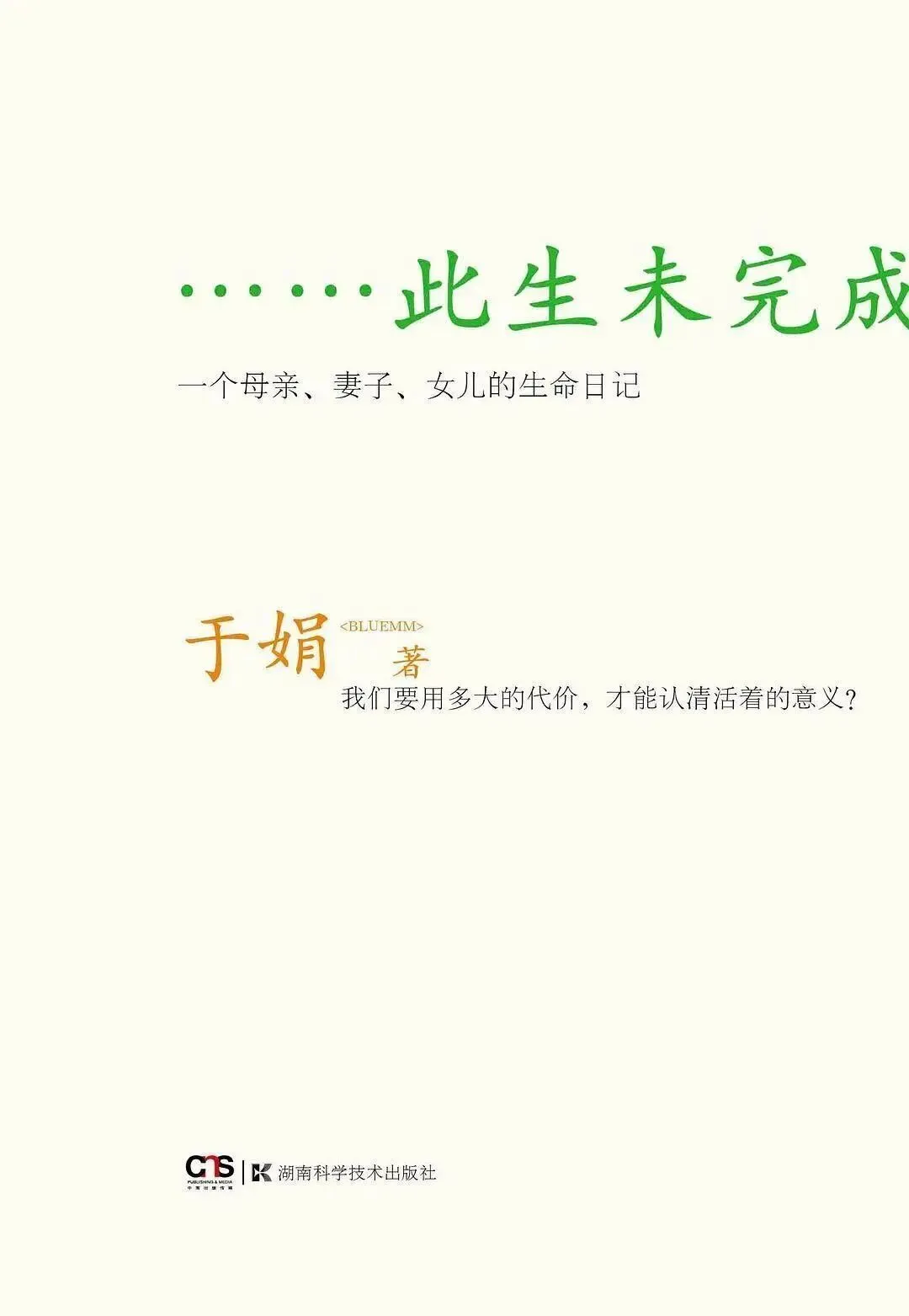 《此生未完成》是复旦大学青年教师于娟在与乳腺癌抗争期间所写的生命日记。于娟在2009年12月被确诊为乳腺癌晚期,此后一年多的时间里,她在博客上更新自己的抗癌经历与感悟。2011年4月,于娟去世,留下多篇“癌症日记”,与生前其他作品一起集结出版,即《此生未完成》。这本书不仅记录了她与癌症抗争的历程,还包含了她对生活的反思、对亲情和友情的感悟,以及对生命意义的深刻思考。
