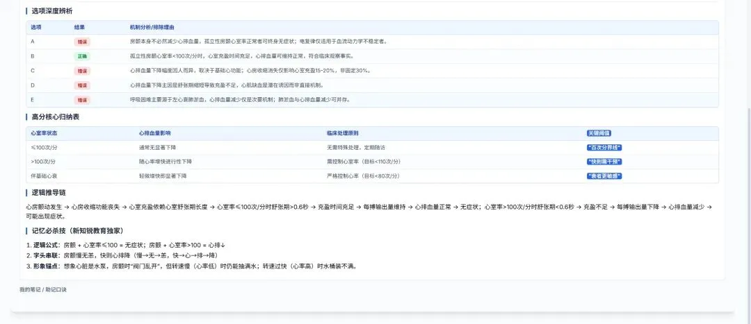 优势: 将晦涩的医学术语翻译成“人话”,让基础薄弱的同学也能秒懂。通过清晰的流程图展示病理生理发展过程(如:心率下降→灌注不足→心跳骤停),帮助考生建立逻辑严密的临床思维,而非死记硬背。3️⃣ 全选项深度拆解 (解析中部表格)