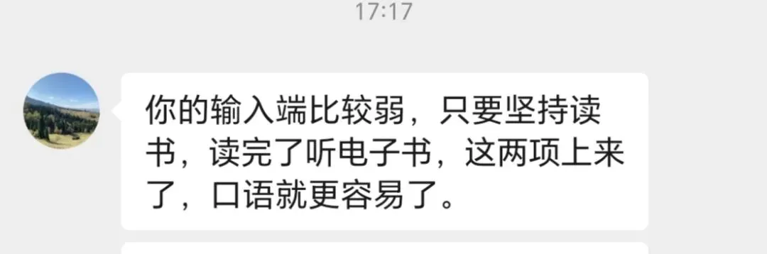 >输入端比较弱,只要坚持读书,读完了听电子书,听力选读上来了,口语就更容易了