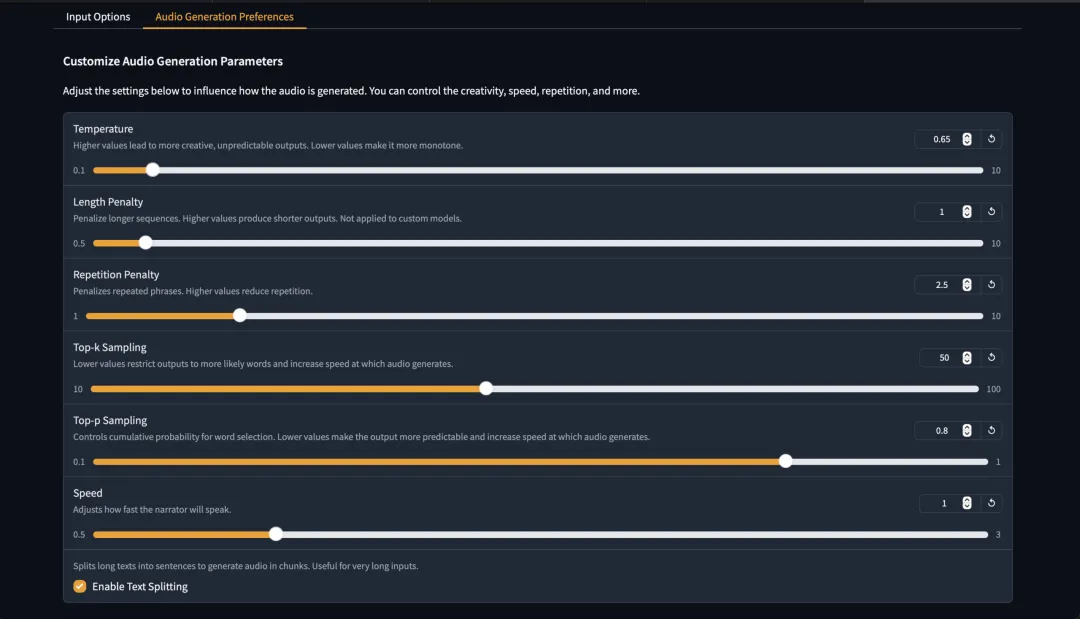 如果你想玩点花的,比如生成中文有声书,或者使用声音克隆,就需要了解一些参数了。