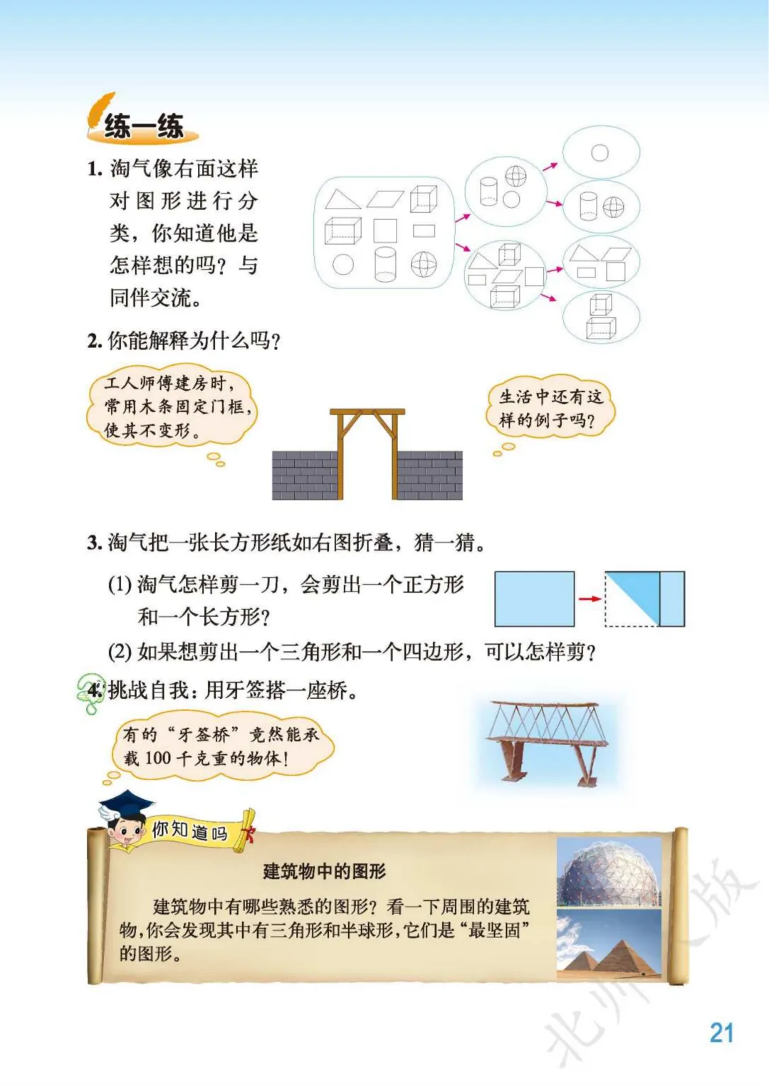 图形分类时,同学们不仅要会用不同的分类方法分类,还要说出按什么标准分类的?或者你能由其他同学分类的结果,想到他分类的标准是什么吗?从而明确:在分类的每一步,都应该清楚划分每一个类别的理由;表达,交流分类标准的过程,就是体会图形特征,加强图形间联系的过程。另外如果你的分类标准可能与教科书中的不一样也没关系,但注意不要太分散哦。