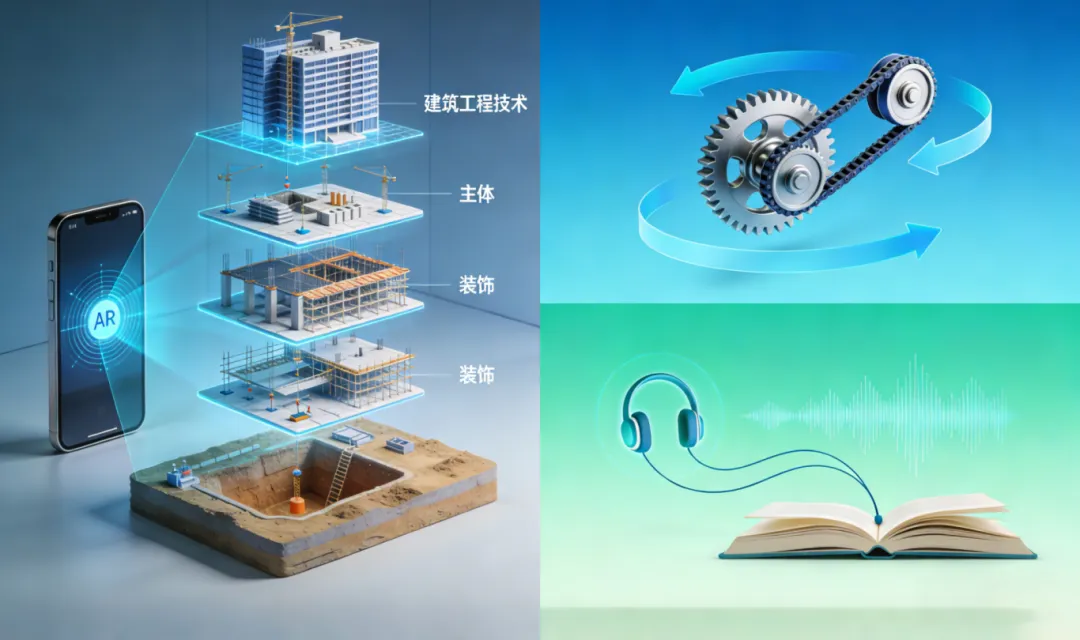比如在建筑工程技术专业,学生用手机扫描数字教材中的AR标识,就能在实景空间中看到3D立体的建筑施工流程,从地基开挖、主体结构搭建到装饰装修,每个环节的施工工艺、材料使用都清晰可见;在机电一体化专业,通过动画演示可直观展示齿轮传动、皮带传动的工作原理,将复杂的机械运动过程拆解为简单易懂的动态画面;针对听觉型学习的学生,还可配套音频讲解,随时随地巩固知识点。