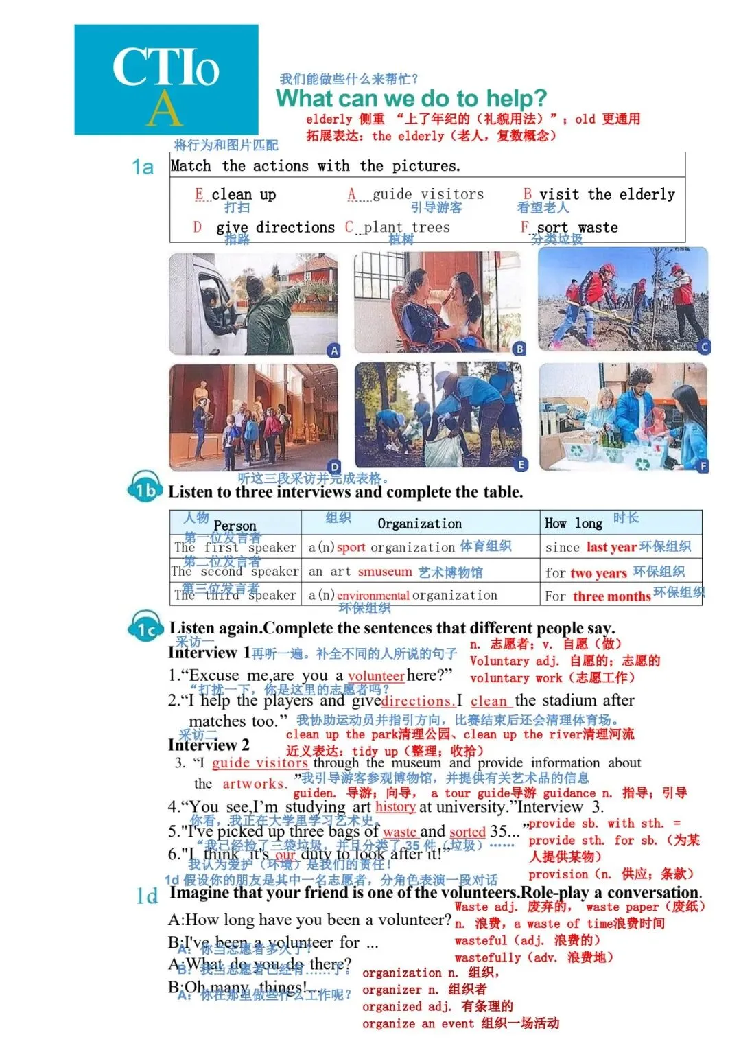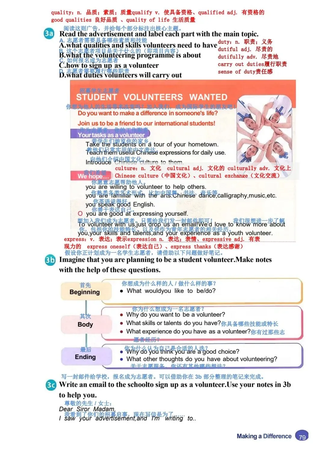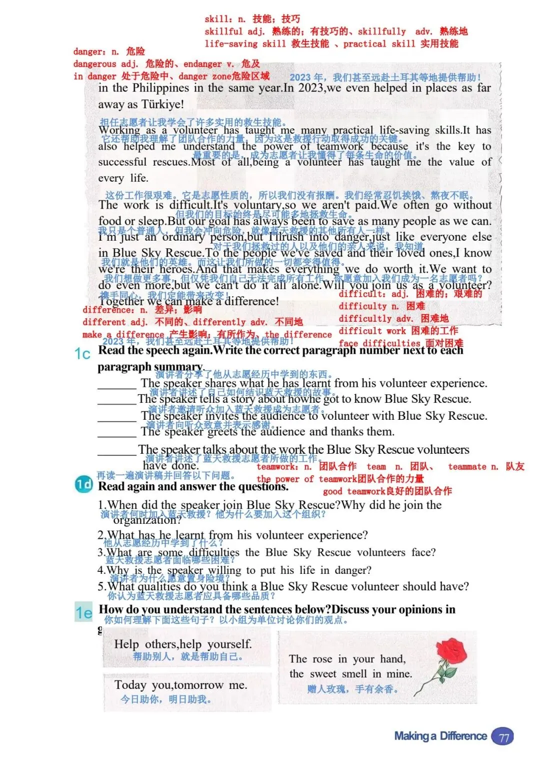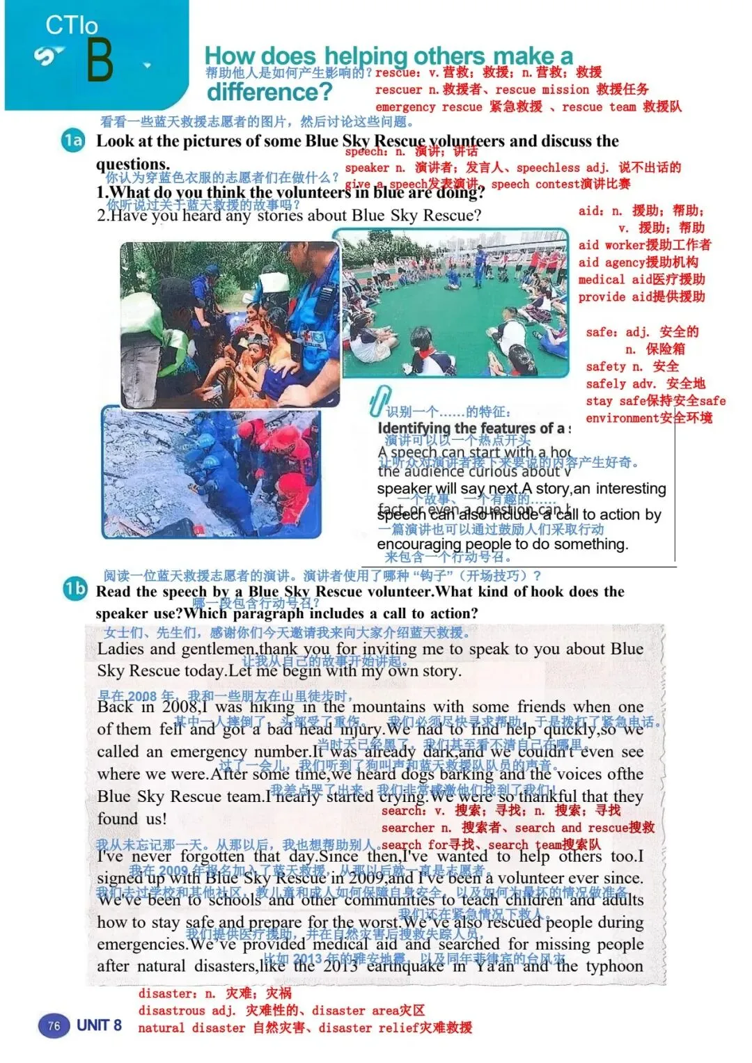 1b 阅读蓝天救援队一名志愿者的演讲。演讲者使用了什么样的引子?哪一段包 含行动号召? 女士们、先生们,感谢你们今天邀请我来和大家讲讲蓝天救援队。让我从自己的 故事讲起。 2008 年,我和一些朋友在山里徒步旅行时,其中一个人摔倒了,头部受了重伤。 我们必须尽快寻求帮助,所以我们拨打了紧急电话。天已经黑了,我们甚至都看 不清自己在哪里。过了一会儿,我们听到了狗叫声和蓝天救援队队员的声音。我 差点哭了出来。我们非常感激他们找到了我们! 我从未忘记那一天。从那以后,我也想帮助别人。我在 2009 年报名加入了蓝天 救援队,从那以后就一直是一名志愿者。我们去过学校和其他社区,教儿童和成 年人如何保持安全并为最坏的情况做准备。我们也在紧急情况下救援过人们。我 们提供过医疗援助,还在自然灾害后搜寻过失踪人员,比如 2013 年的雅安地震 和同年菲律宾的台风灾害。2023 年,我们甚至还去了远在土耳其的地方提供帮 助! 做志愿者教会了我许多实用的救生技能。它也帮助我理解了团队合作的力量,因 为这是成功救援的关键。最重要的是,做志愿者让我懂得了每个生命的价值。 这份工作很艰难。它是志愿性质的,所以我们没有报酬。我们经常没吃的、没觉 睡。但我们的目标一直是尽可能多地拯救生命。我只是一个普通人,但我会冲向 危险,就像蓝天救援队的每一个人一样。对于我们拯救过的人以及他们的亲人来 说,我知道我们是他们的英雄。而这让我们所做的一切都值得。我们想做更多, 但我们不能单靠自己做到。你们愿意作为志愿者加入我们吗?我们一起就能有所 作为! |