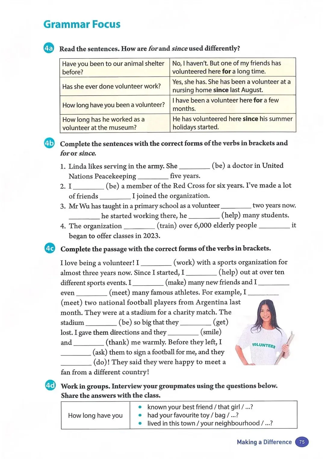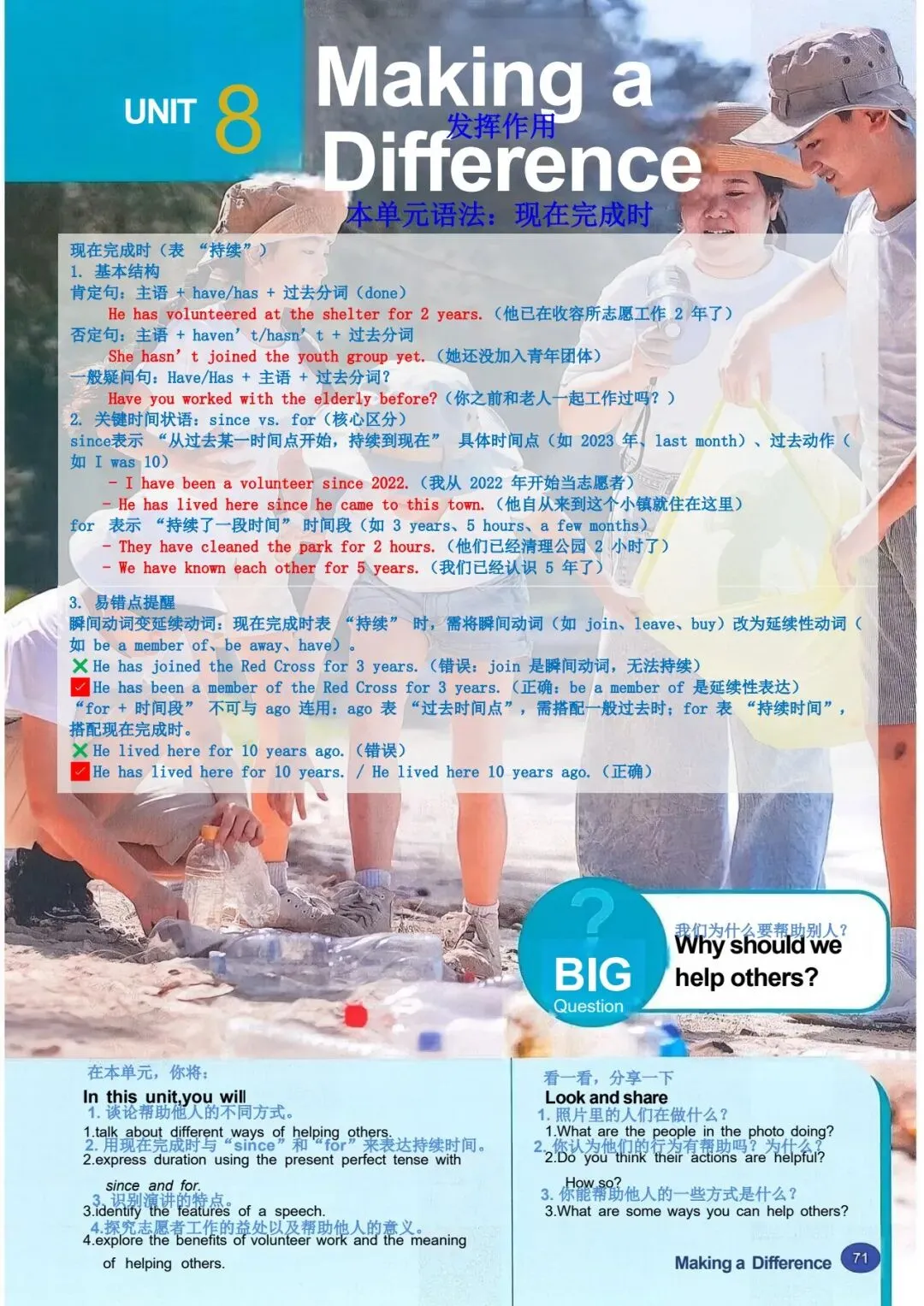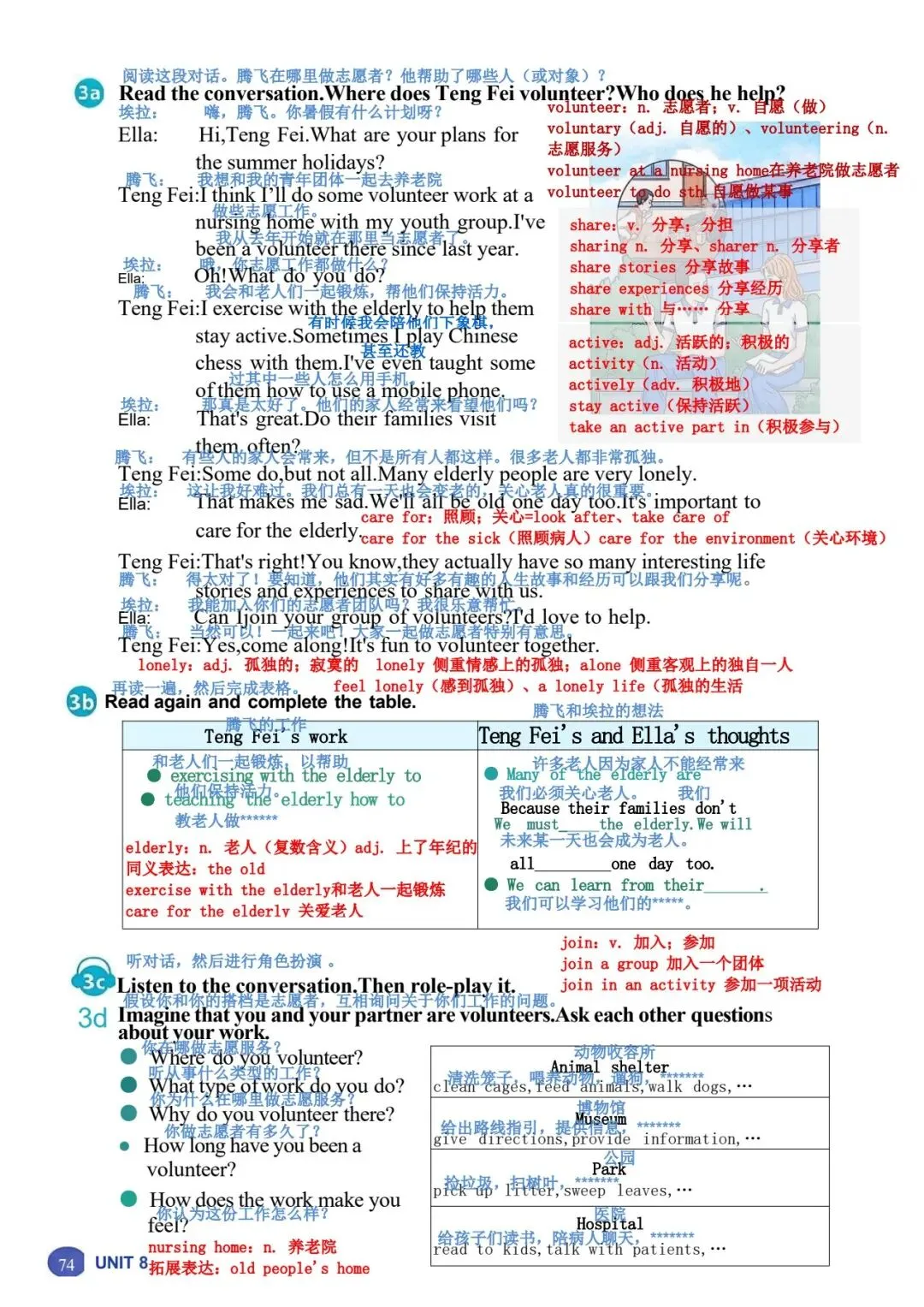 1b 阅读蓝天救援队一名志愿者的演讲。演讲者使用了什么样的引子?哪一段包 含行动号召? 女士们、先生们,感谢你们今天邀请我来和大家讲讲蓝天救援队。让我从自己的 故事讲起。 2008 年,我和一些朋友在山里徒步旅行时,其中一个人摔倒了,头部受了重伤。 我们必须尽快寻求帮助,所以我们拨打了紧急电话。天已经黑了,我们甚至都看 不清自己在哪里。过了一会儿,我们听到了狗叫声和蓝天救援队队员的声音。我 差点哭了出来。我们非常感激他们找到了我们! 我从未忘记那一天。从那以后,我也想帮助别人。我在 2009 年报名加入了蓝天 救援队,从那以后就一直是一名志愿者。我们去过学校和其他社区,教儿童和成 年人如何保持安全并为最坏的情况做准备。我们也在紧急情况下救援过人们。我 们提供过医疗援助,还在自然灾害后搜寻过失踪人员,比如 2013 年的雅安地震 和同年菲律宾的台风灾害。2023 年,我们甚至还去了远在土耳其的地方提供帮 助! 做志愿者教会了我许多实用的救生技能。它也帮助我理解了团队合作的力量,因 为这是成功救援的关键。最重要的是,做志愿者让我懂得了每个生命的价值。 这份工作很艰难。它是志愿性质的,所以我们没有报酬。我们经常没吃的、没觉 睡。但我们的目标一直是尽可能多地拯救生命。我只是一个普通人,但我会冲向 危险,就像蓝天救援队的每一个人一样。对于我们拯救过的人以及他们的亲人来 说,我知道我们是他们的英雄。而这让我们所做的一切都值得。我们想做更多, 但我们不能单靠自己做到。你们愿意作为志愿者加入我们吗?我们一起就能有所 作为! |