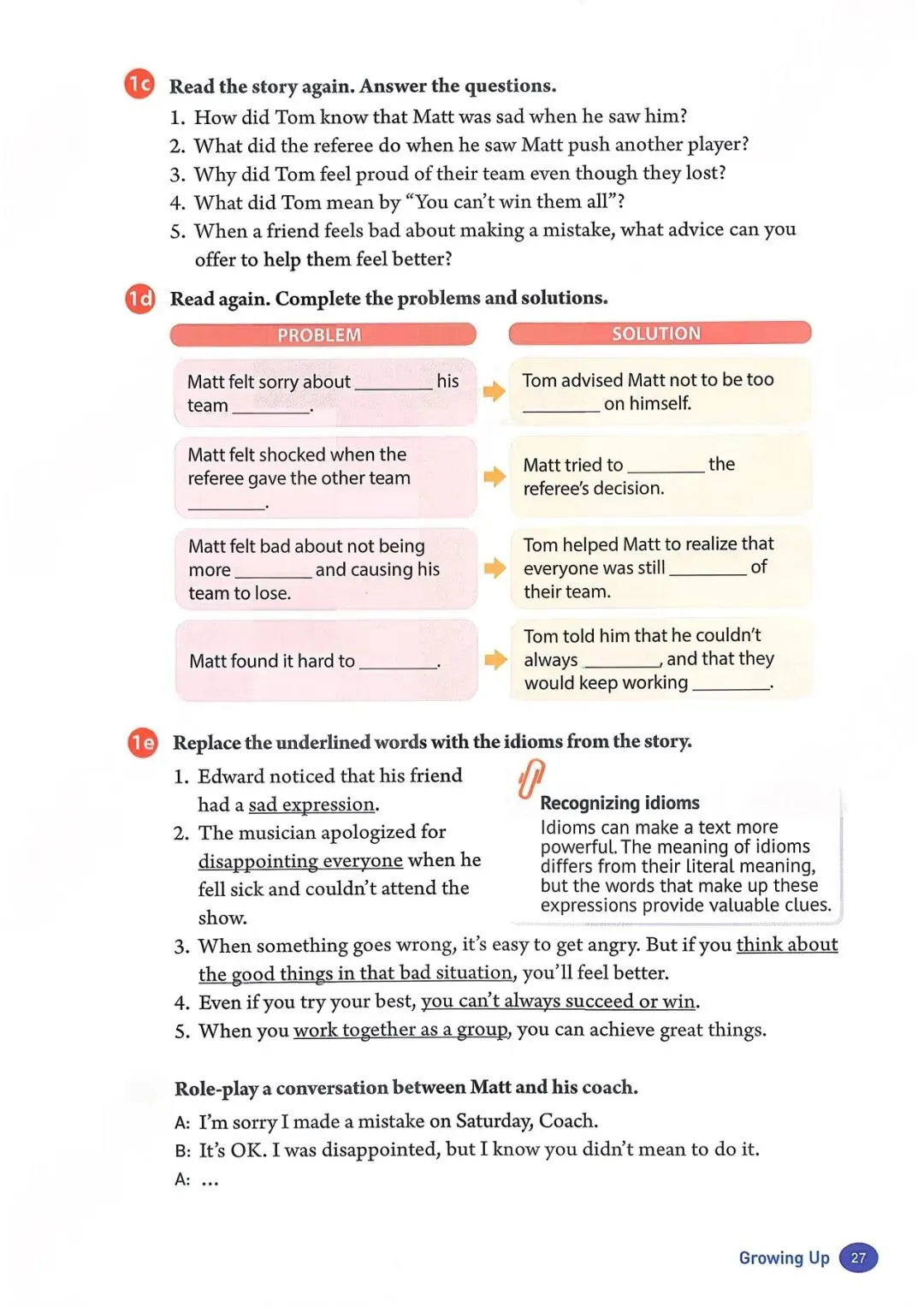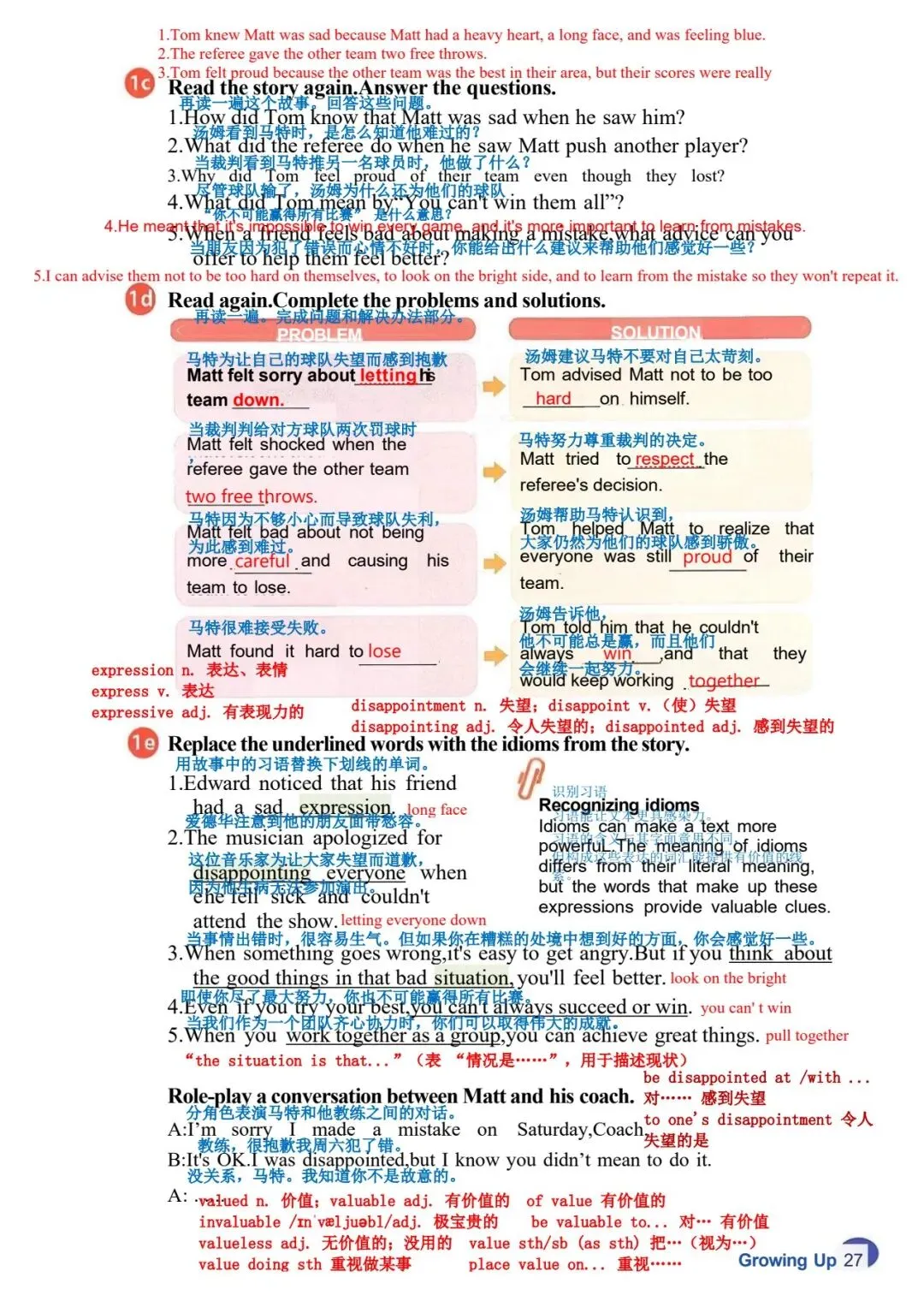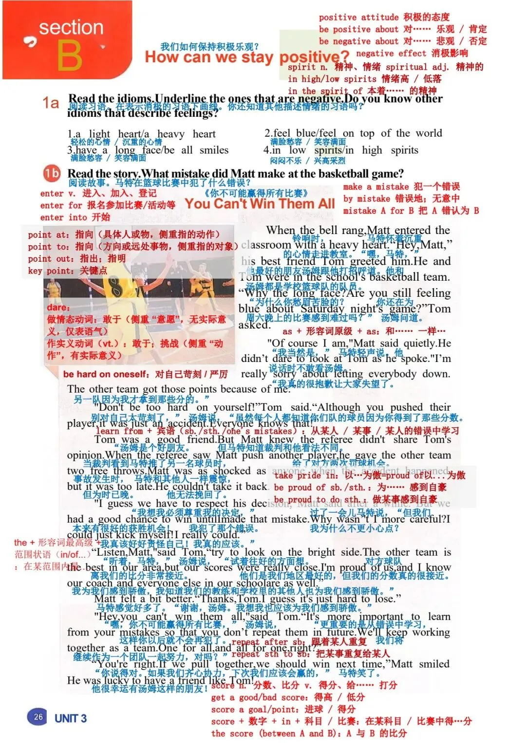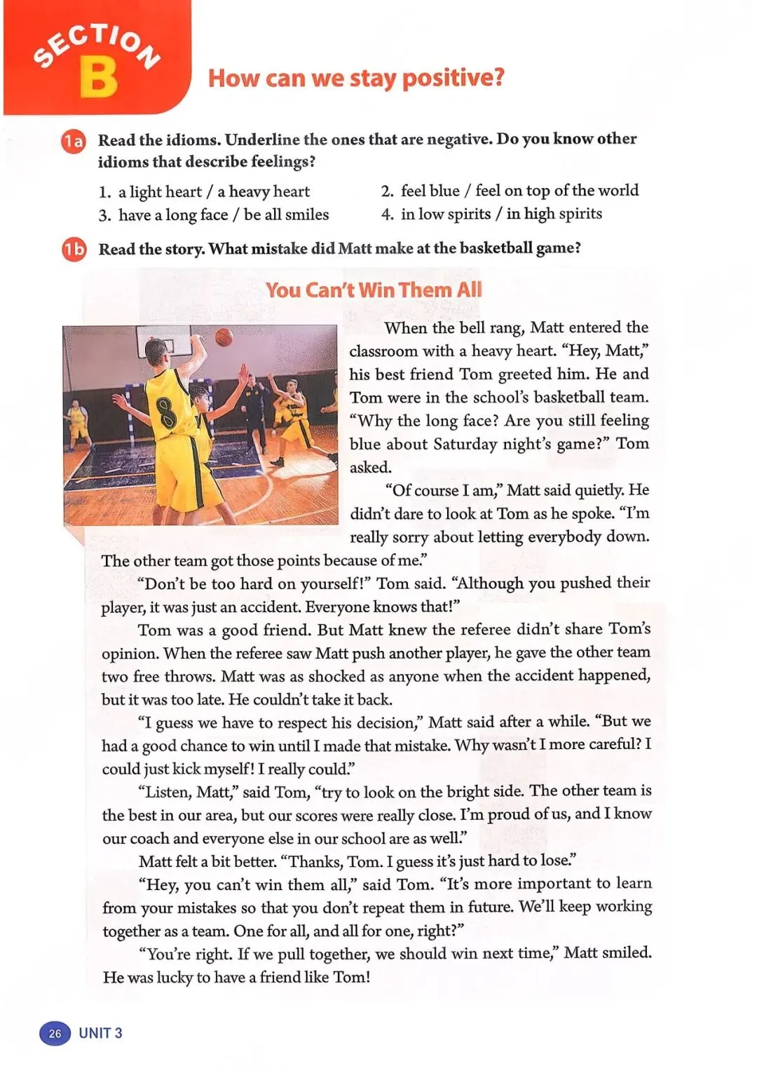 你不可能常胜 铃声响起时,马特心情沉重地走进教室。“嘿,马特,” 他最好的朋友汤姆跟他 打招呼。他和汤姆都在学校篮球队。“为什么闷闷不乐?你还在为周六晚上的比 赛感到难过吗?” 汤姆问道。 “我当然难过,” 马特轻声说。他说话时都不敢看汤姆。“我真的很抱歉让大家失 望了。对方球队因为我才得到那些分数。” “别对自己太苛刻了!” 汤姆说,“虽然你推了他们的球员,但那只是个意外。大 家都知道的!” 汤姆是个好朋友。但马特知道裁判和汤姆看法不同。当裁判看到马特推了另一名 球员时,给了对方球队两次罚球机会。事故发生时,马特和其他人一样震惊,但 为时已晚,他无法挽回了。 “我想我们得尊重他的判罚,” 过了一会儿,马特说,“但在我犯那个错误之前, 我们本来很有机会赢的。我为什么不更小心点呢?我真该自责!真的该自责。” “听着,马特,” 汤姆说,“试着往好的方面想。另一支球队是我们地区最好的, 但我们的比分真的很接近。我为我们感到骄傲,而且我知道我们的教练和学校里 的其他人也一样。” 马特感觉好了一点。“谢谢,汤姆。我想输了比赛就是很难受。” “嘿,你不可能常胜,” 汤姆说,“更重要的是从错误中学习,这样你以后就不会 再犯了。我们会继续作为一个团队一起努力。人人为我,我为人人,对吧?” “你说得对。如果我们齐心协力,下次我们应该能赢,” 马特笑了。他很幸运有 汤姆这样的朋友! |