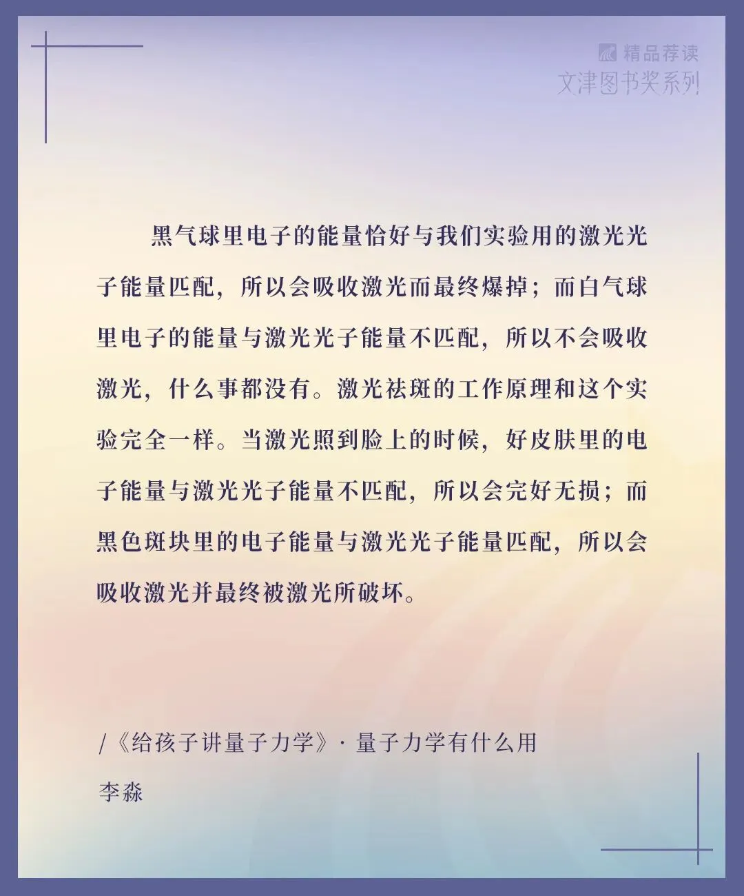 好皮肤和斑点,其内部电子的能量是不一样的。与此同时,每种激光的光子又都有一个特定的能量。当激光打到皮肤上时,如果皮肤的电子能量与激光光子的能量不匹配,那它就不会吸收这种激光。反之,它就会吸收这种激光。