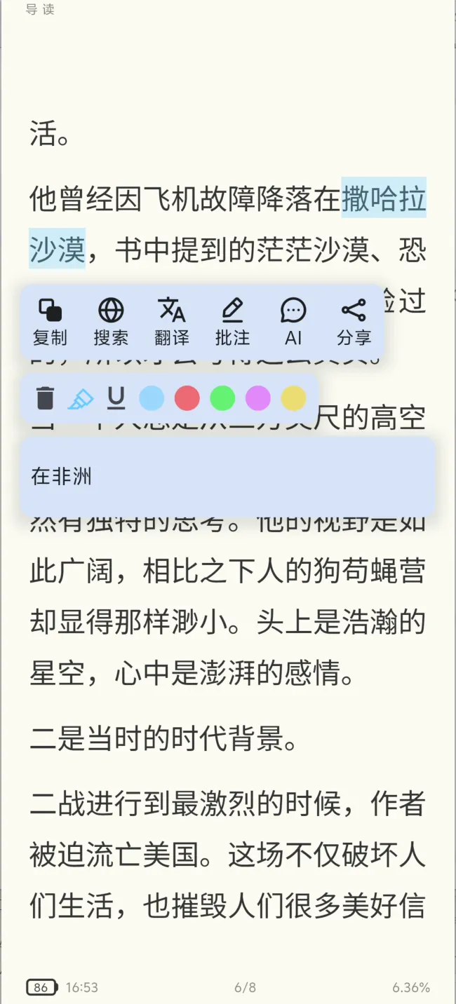 笔记与 AI 问答 :这个软件还支持做笔记和 AI 问答。笔记的话是长按选中,然后进行文字选择,它会弹出一个对话框,这个对话框里面可以进行复制、搜索、翻译、批注(笔记)、AI及分享功能,非常方便。
