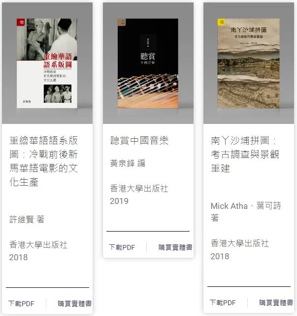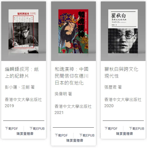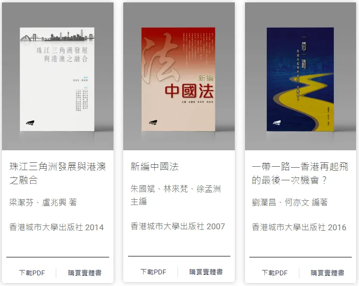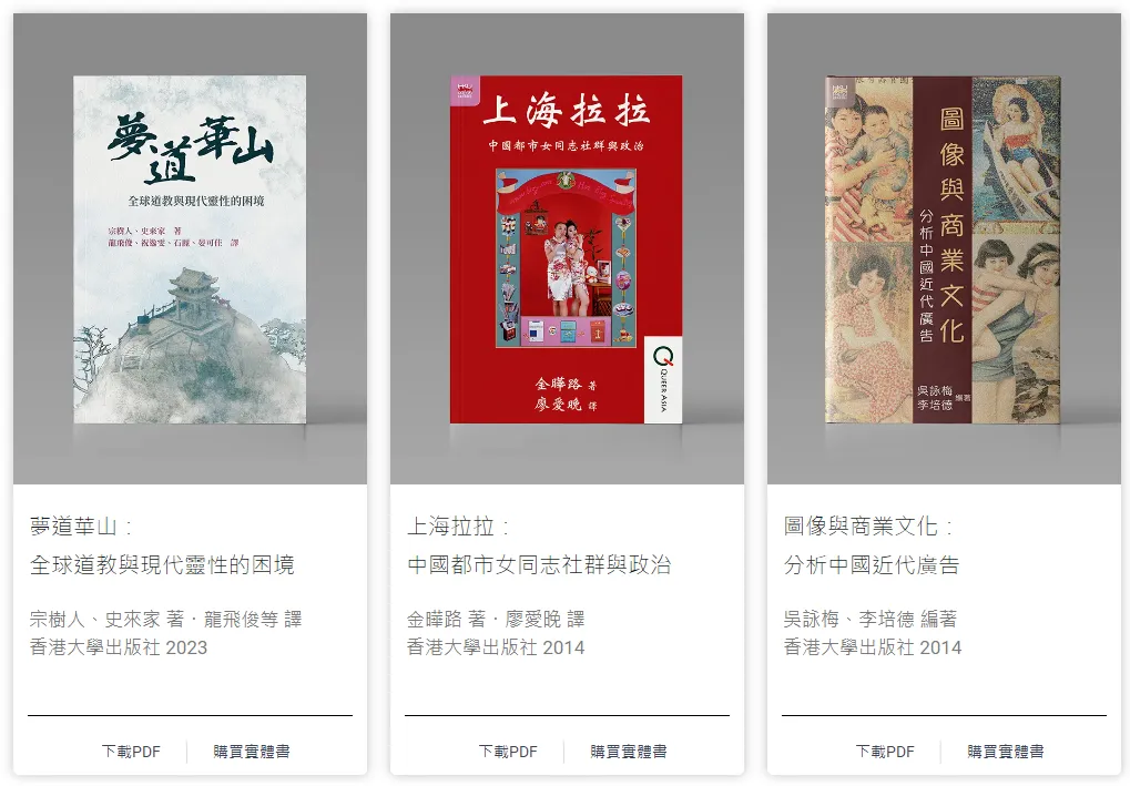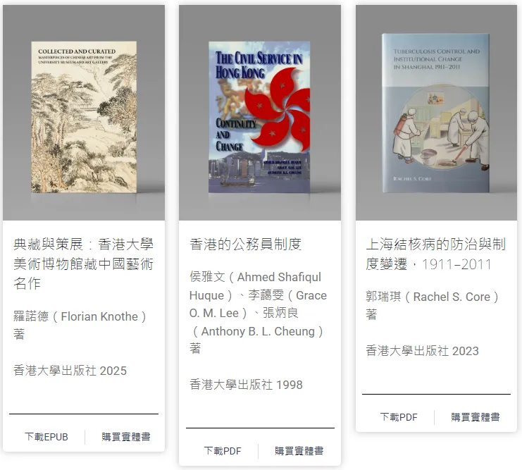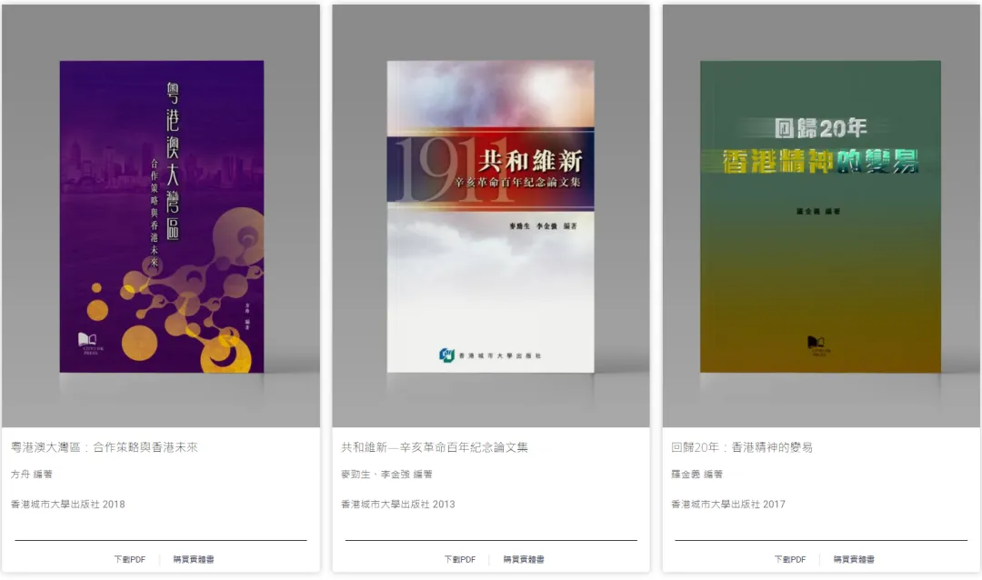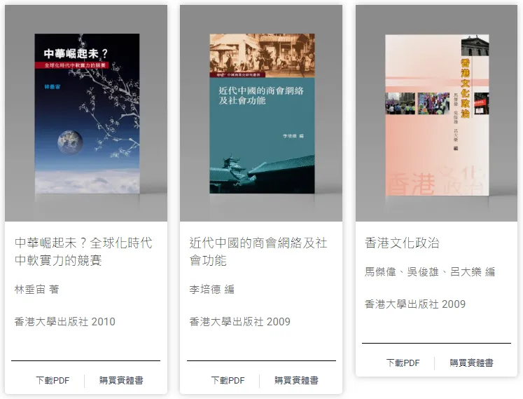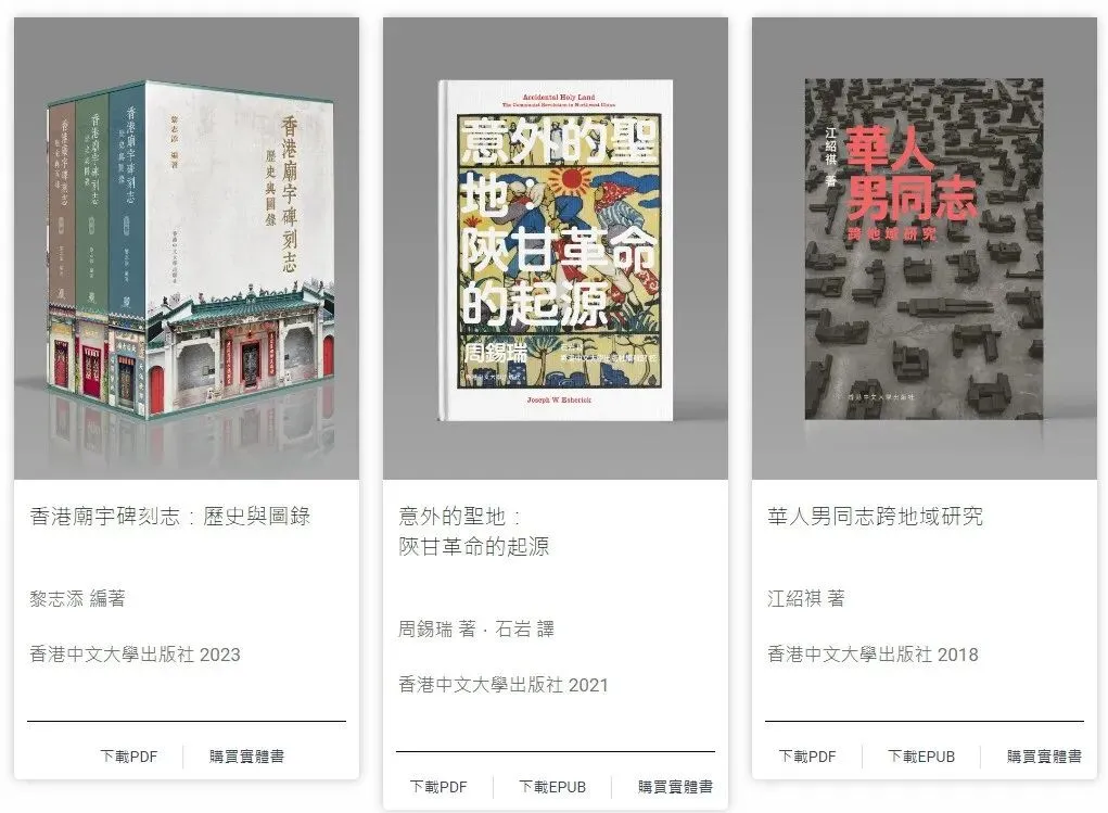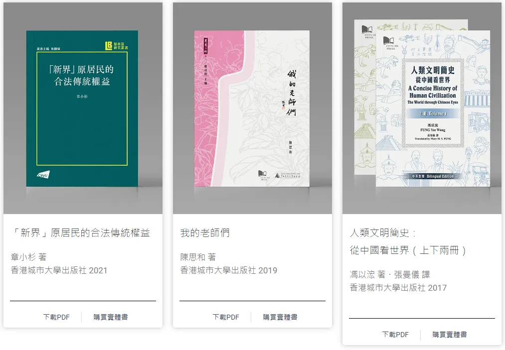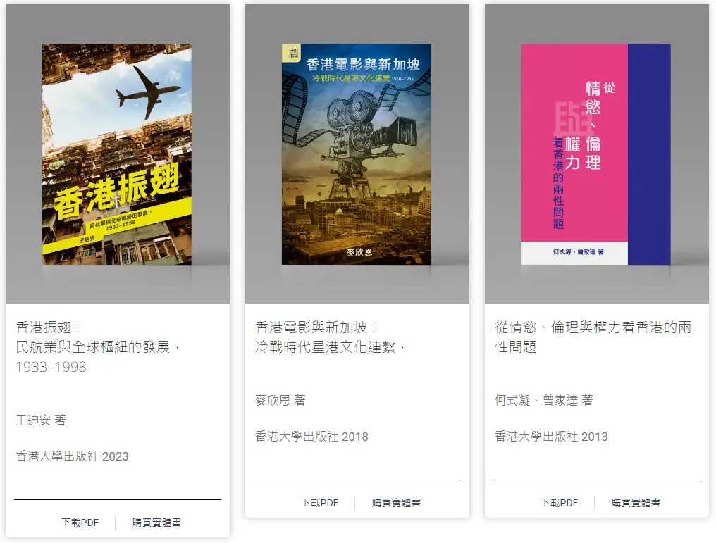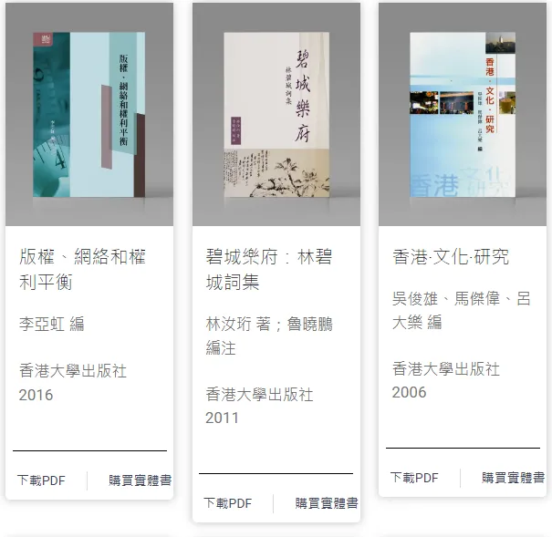 - 由香港中文大學、香港城市大學和香港大學三間高等教育院校的圖書館與出版社聯合發起的開讀(Open Books Hong Kong)先導計劃,是香港首個開放取用(open access)圖書計劃。圖書內容涵蓋歷史、哲學、宗教、法學、人類學、性別研究等人文社科多個領域。