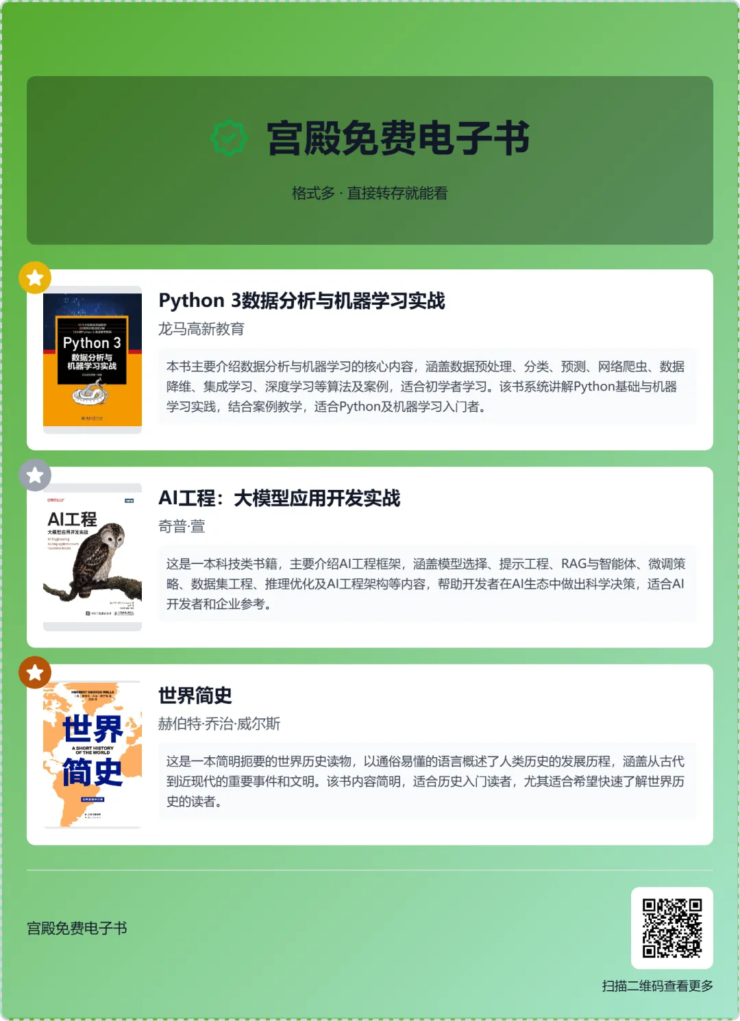 当前位置:首页>电子书资讯>【免费电子书】Python 3数据分析与机器学习实战,AI工程:大模型应用开发实战,世界简史